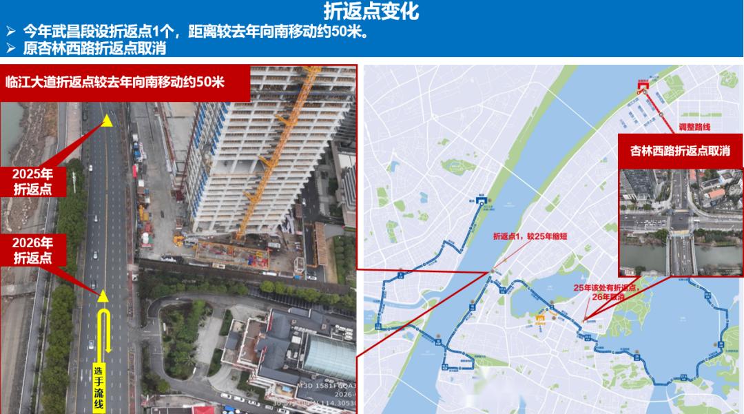 折返点调整:武昌段设折返点1个(位于临江大道禾丽医疗美容前),距离较去年向南移动约50米,原杏林西路折返点取消。