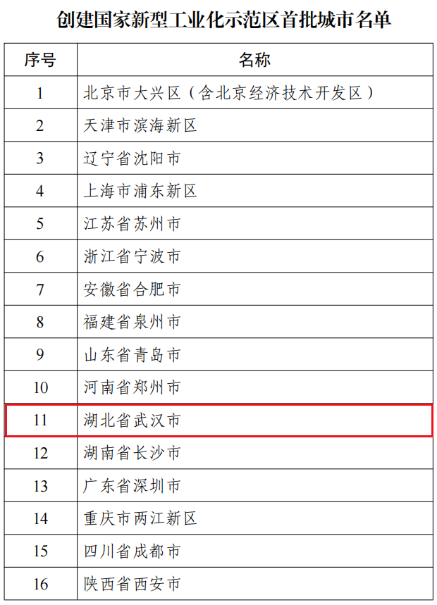 湖北日报讯(通讯员武经宣、记者马文俊)3月16日,工业和信息化部公布全国首批16个创建国家新型工业化示范区城市名单,武汉成功入选。长期以来,武汉在培育壮大先进制造业集群,推动制造业智能化、绿色化、融合化发展方面持续探索,此次入选,将肩负起为全国新型工业化探路先行的重任。