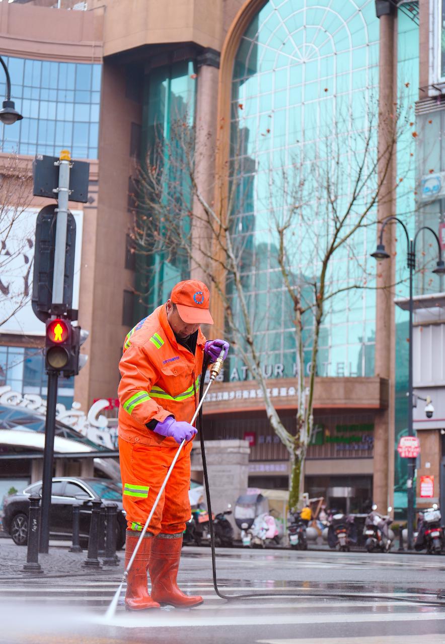 3月18日上午,江城春雨绵绵。雨水中,几名环卫师傅正清扫着路面积水与落叶,高压冲洗车紧随其后,强劲的水流将路面污渍与泥浆冲入下水道,青黑色的沥青路面映衬着洁白的交通标线,格外清晰醒目。