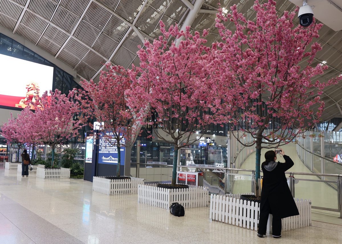 3月17日,走进武汉站,20棵约3米高的真樱花树已然盛放,粉色花瓣缀满枝头,或轻垂于进站口檐下,或掩映于候车区廊间,花影摇曳间,将高铁站打造成春日限定“打卡地”。