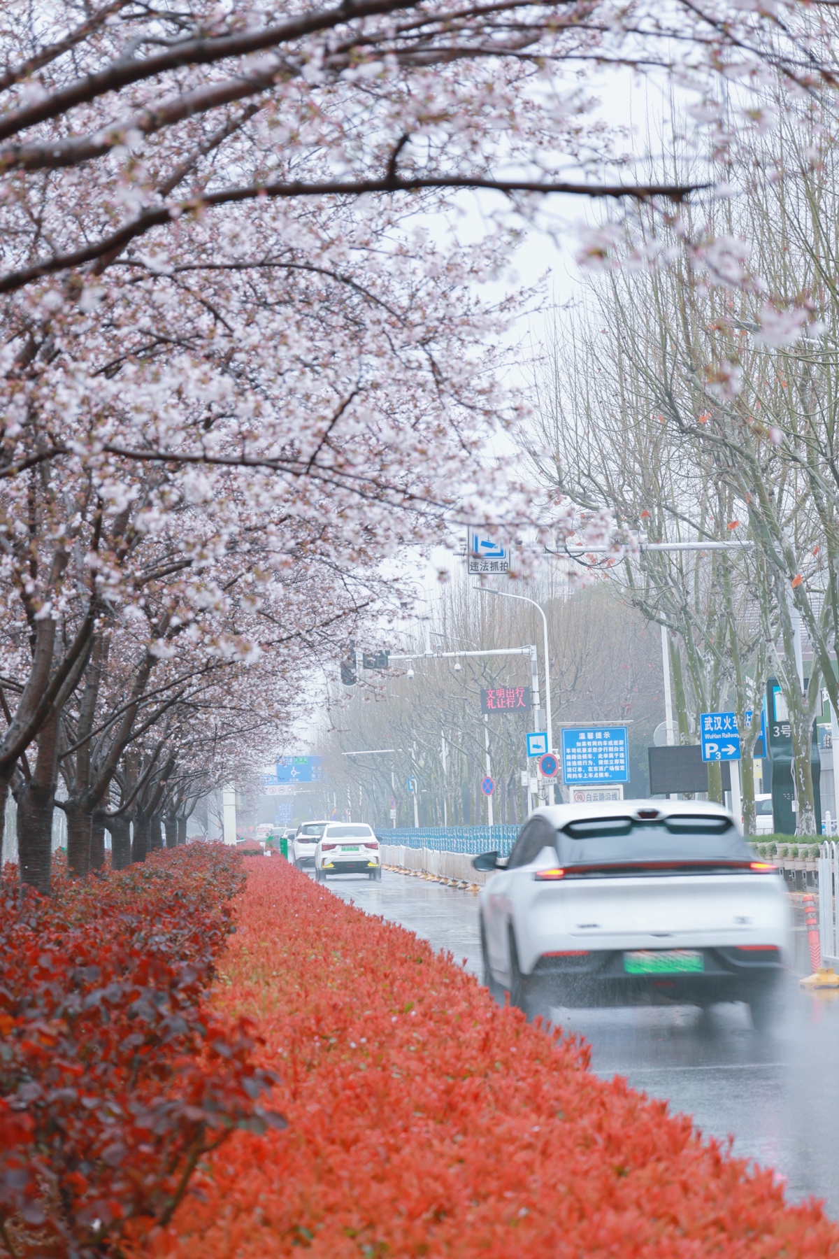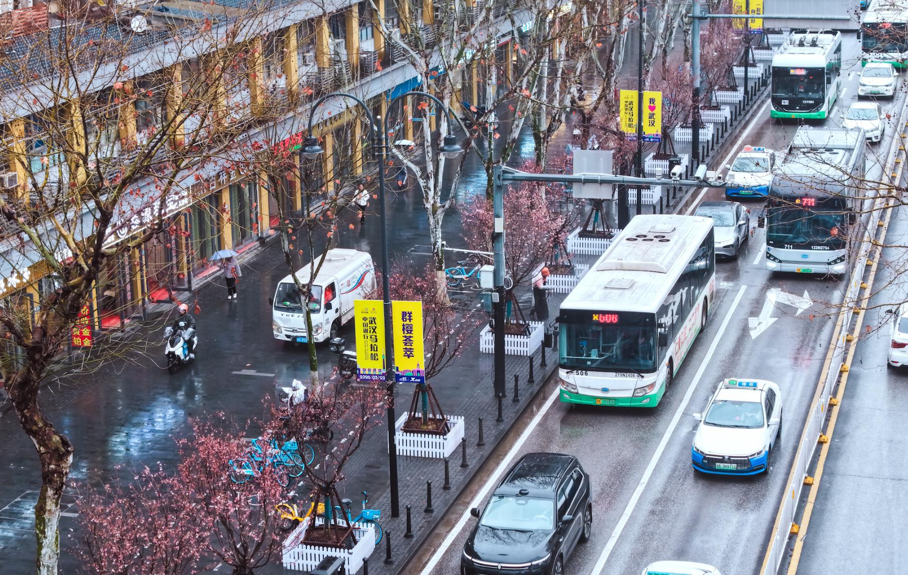 自3月初起,江汉区城管执法局对全长1.5公里的汉马保障线路启动环境整治提升。记者探访看到,赛道沿线两侧180株“移动”樱花已全部布置完毕,枝头结满花苞,部分已悄然绽放。在江汉路步行街口中分带,新栽的时花为雨中的街道增添亮色。