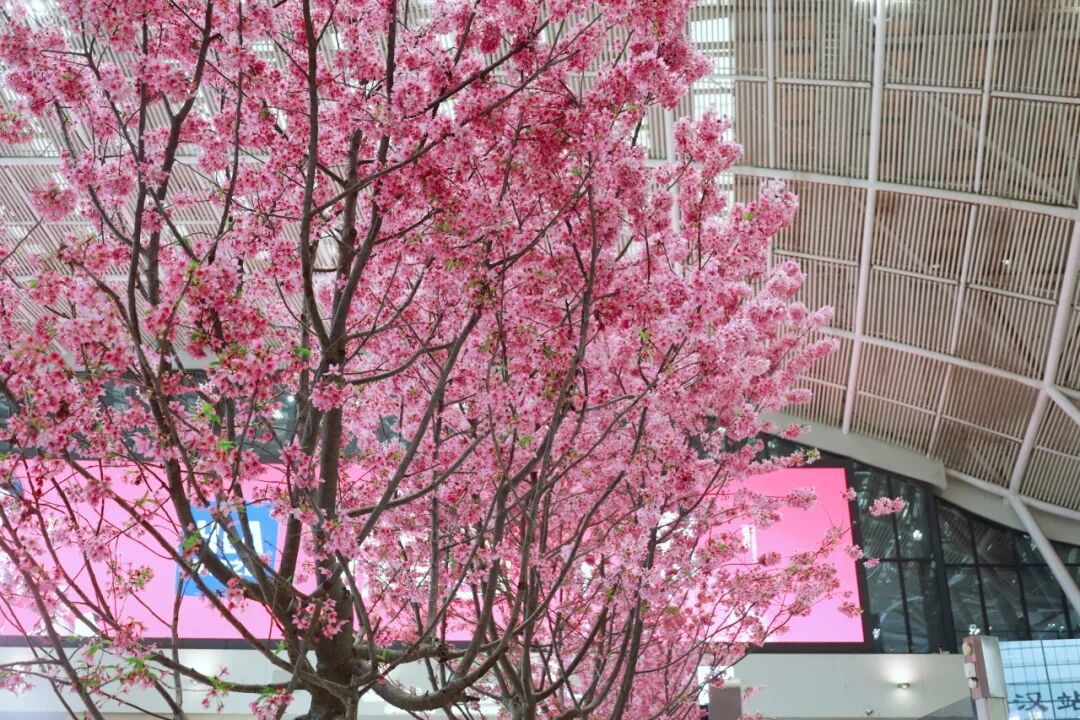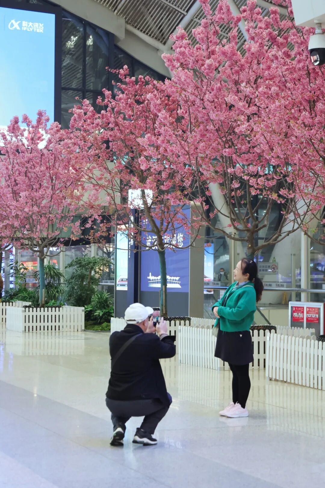 3月17日,步入武汉火车站,一幅流动的春日画卷徐徐展开。东、西进站平台与候车大厅内,20株约3米高的真樱花树已迎来盛花期。粉色的花瓣密密匝匝,缀满枝头,或轻垂于进站口的飞檐之下,与流线型的现代建筑相映成趣;或掩映于候车区的廊柱之间,为步履匆匆的旅途平添几分诗意。花影摇曳,暗香浮动,引得过往旅客纷纷驻足,举起手机,将这份属于武汉站的“春日限定”打卡珍藏。整洁明亮的窗格外,樱花烂漫,景致交融,让高铁站化身为城市最美的会客厅一角。