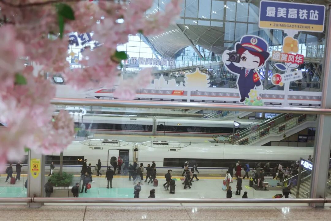 这趟开往春天的列车,是武汉市园林局、市交通运输局、武汉火车站、洪山区武汉站地区综管办等多个部门携手为旅客精心营造的“沉浸式”春日礼遇。据介绍,樱花树主要布置于东、西进站平台及候车大厅等人流密集区域,让抵汉的游客第一时间就能感受到扑面而来的春天气息和城市热情。