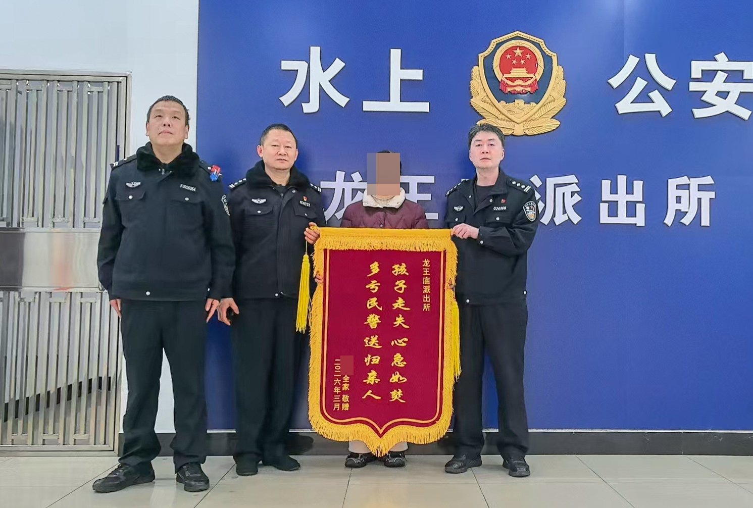 3月16日下午,孩子的母亲特意来到水上分局龙王庙派出所,送上一面锦旗,再次向民辅警的暖心之举表达感激之情。