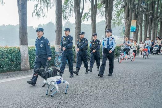 在东湖,巡逻并非单打独斗。张蕊介绍,景区采用“警犬+机器警犬+民警+无人机”的“空地一体”模式,“启生”与“园园”的加入,提升了巡逻队伍处置各类突发情况的能力。东湖赏花季期间,有游客求助手机丢失、孩童走失,虽非追踪专业犬,但“启生”沉稳的表现有效安抚了求助者情绪,为民警搜寻创造了条件,用另一种方式守护着游客平安。