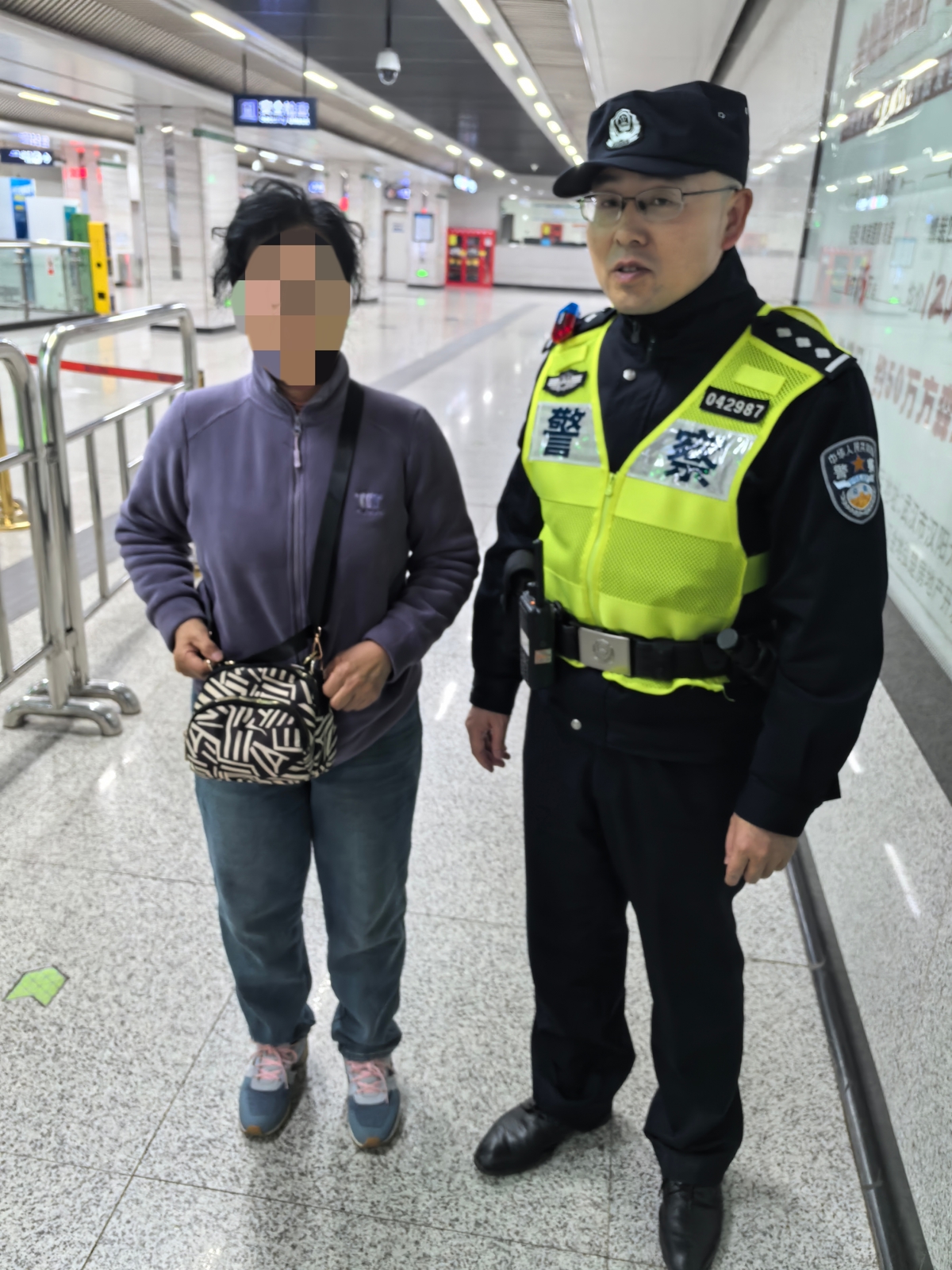 接到求助后,民警陈韬及时安抚老人的情绪,第一时间安排辅警杜昀调看视频监控,追踪李奶奶在车站内的行动轨迹,排查挎包是否遗落在站内其他地方,同时通知车站方面进行全线广播寻物,并联动相邻站点协助查找。考虑到老人们年事已高且情绪激动,陈韬和辅警郭胜不断安慰道:“婆婆您别着急,我们一定尽全力帮您找,请放心!”