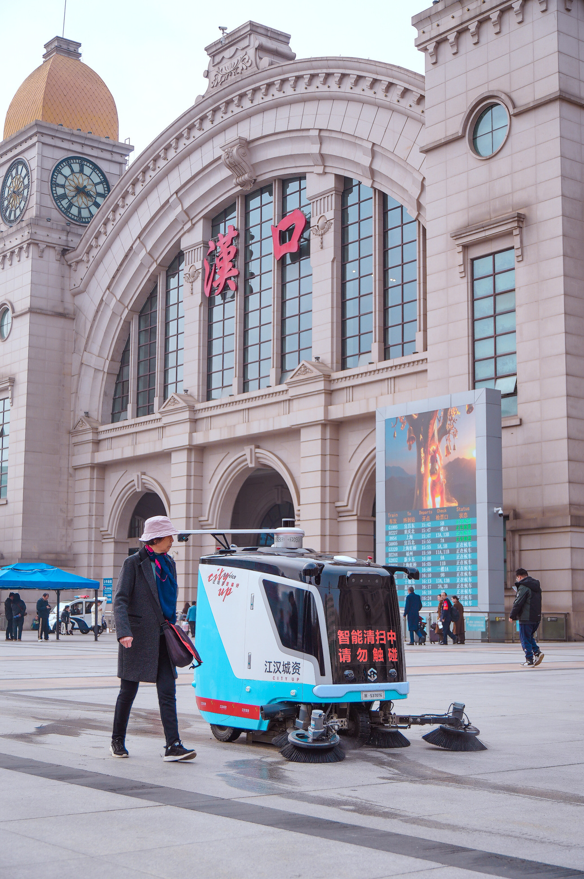 这台会喊话的机器人,是汉口火车站地区综合管理办公室最近引入的AI智能巡检机器人。它的上岗,也意味着汉口火车站站区正式开启了“全域智能运营”模式——不仅有机器人巡逻,还有机器人扫地,后台还有一块智慧大屏统筹调度,科技感直接拉满。