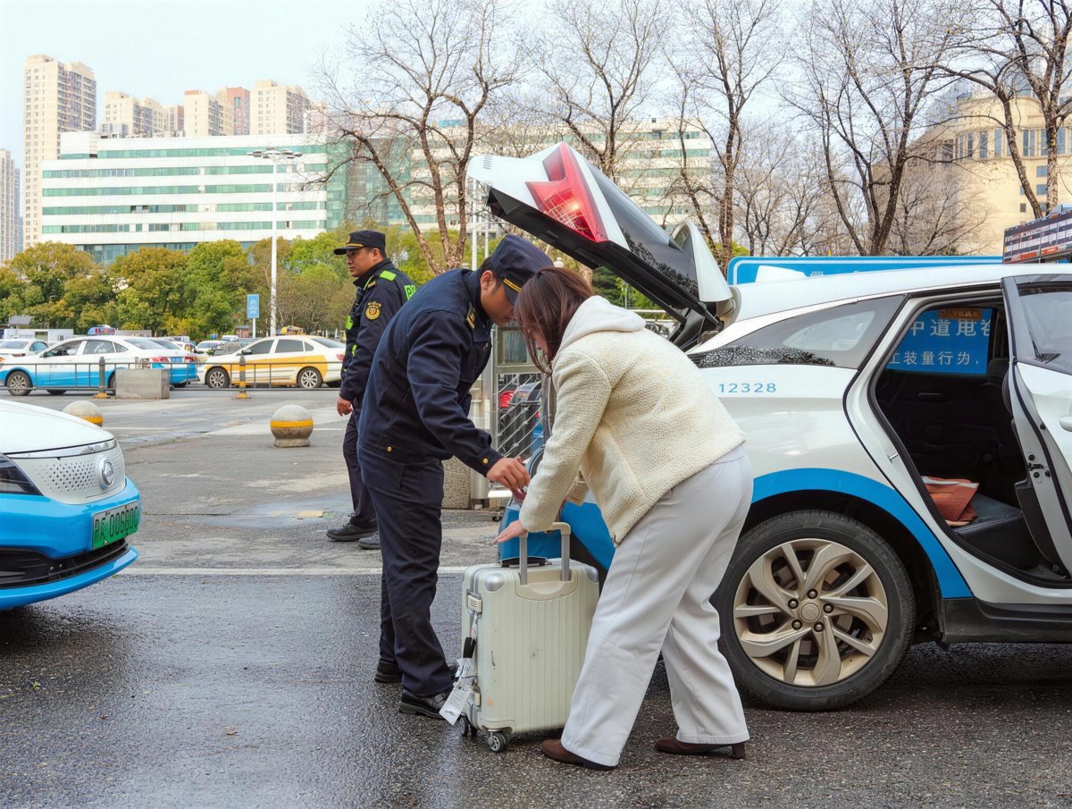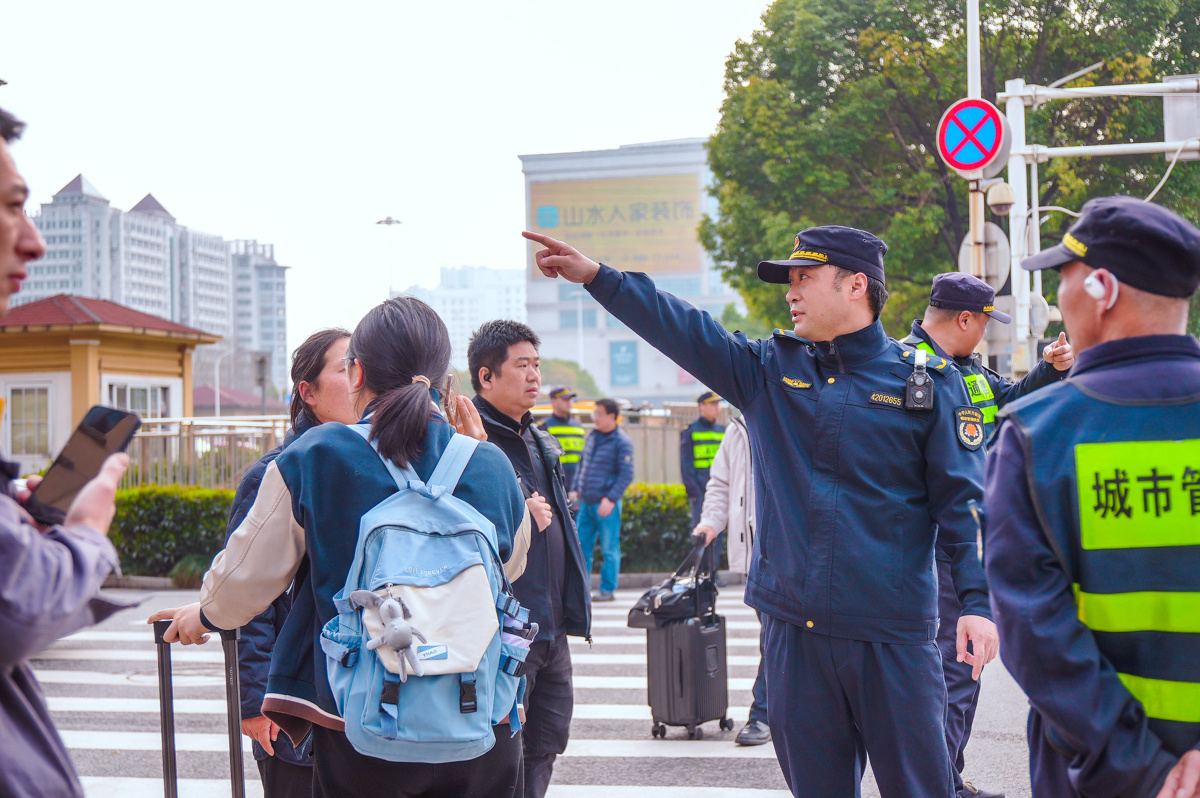 在南广场出租车上客区,中队设立固定服务岗,采取“定点值守+动态巡查”方式,引导旅客有序乘车、出租车规范停靠。遇到拎着大件行李的老人或带孩子的家长,队员们立即上前帮助搬运行李,引导他们快速上车。针对网约车接驳点拥堵的情况,队员耐心指引乘客前往指定的网约车上车点,避免在车流中来回奔波。