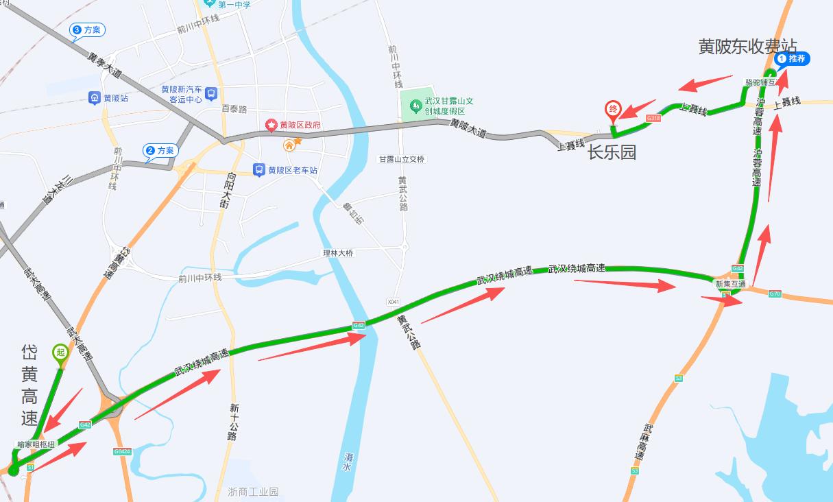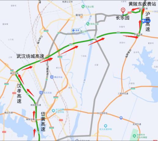 线路:岱黄高速黄陂收费站→武汉绕城高速→沪蓉高速→黄陂东收费站→G318→长乐园。(原路返回)