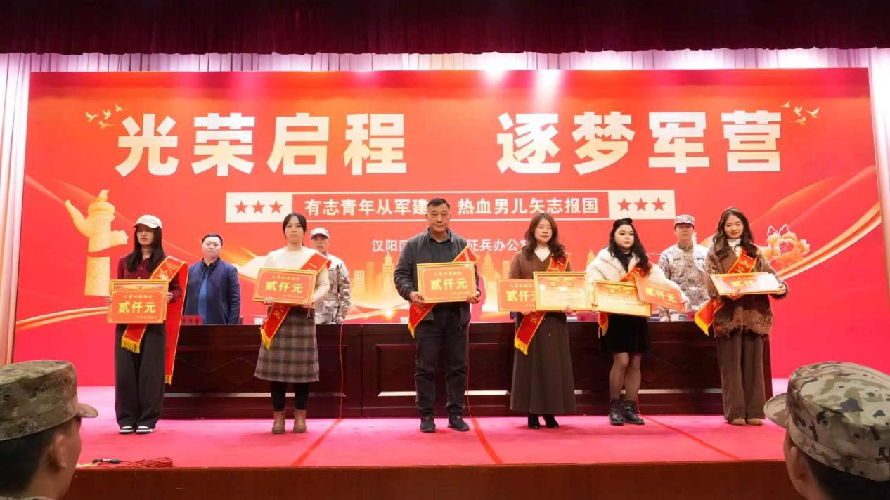 大会现场座无虚席,全体入伍新兵身着荒漠迷彩服、身披“光荣入伍”绶带、胸戴大红花,身姿挺拔、精神抖擞,眉宇间满是青春的朝气与投身国防的坚定,尽显新时代汉阳青年的昂扬风貌。