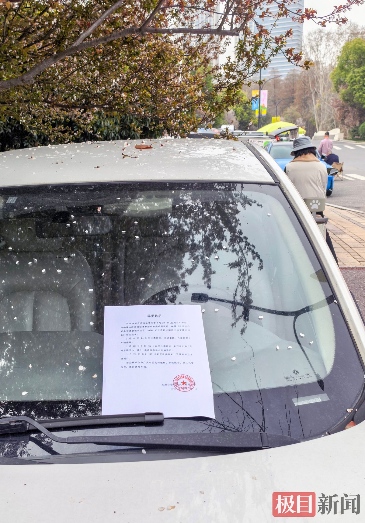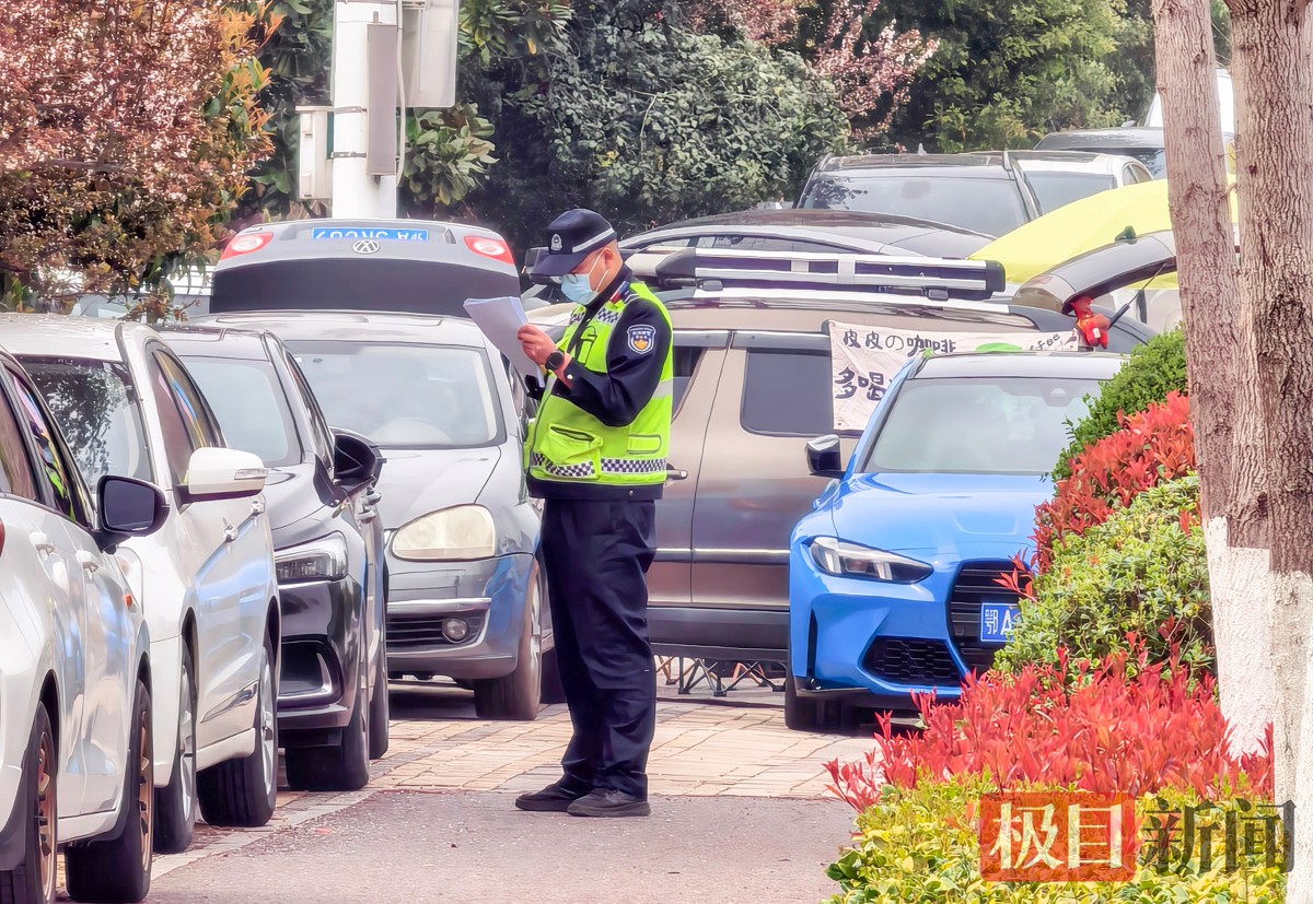 3月19日,新闻记者在东湖白马道看到,东湖公安分局交通大队民警辅警正向附近车主开展宣传提醒,对无人值守车辆夹放温馨提示单,全力保障3月22日武汉马拉松安全顺利举行。