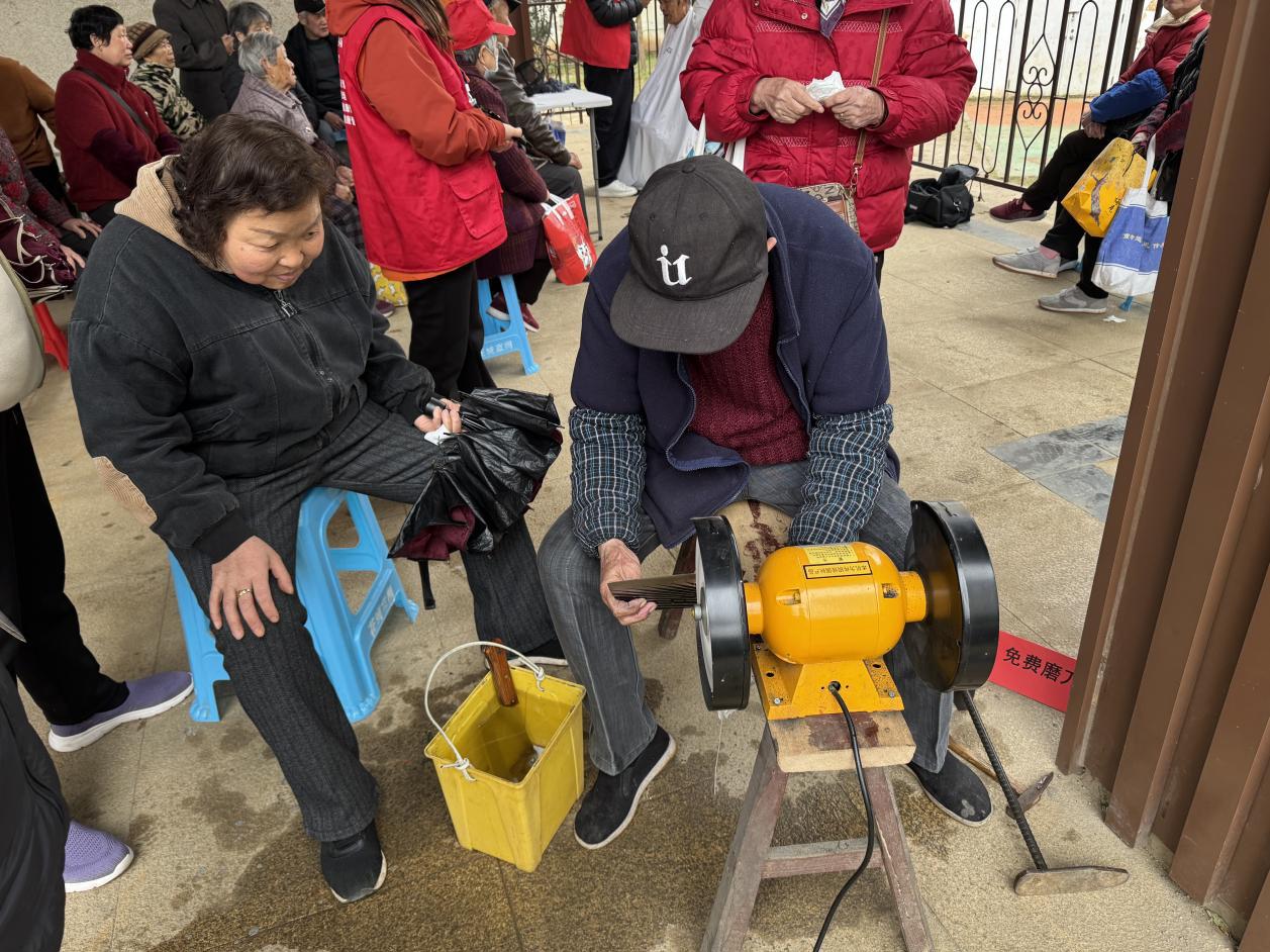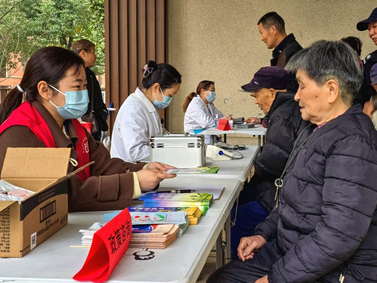 与此同时,缝补、磨刀等“老手艺”服务台与健康义诊专区前也排满了循声而来的居民。在便民摊位前,伴随着磨刀石的“沙沙”声和缝纫机的“哒哒”声,一把把生锈迟钝的菜刀变得光洁锋利,一件件开线破损的衣物被修补平整,这些不起眼的“小修小补”切实解决了群众的烦心事。而在义诊专区,花山社区卫生服务中心的医护人员细致地为居民测量血压、血糖,耐心解答中老年人关于慢性疾病的疑问,并结合春季气候多变的特点,向大家普及传染病预防和日常养生保健知识。从生活琐事的修补到身体健康的守护,各项服务精准切中居民的实际痛点,将防线与温暖一同筑牢在社区一线。