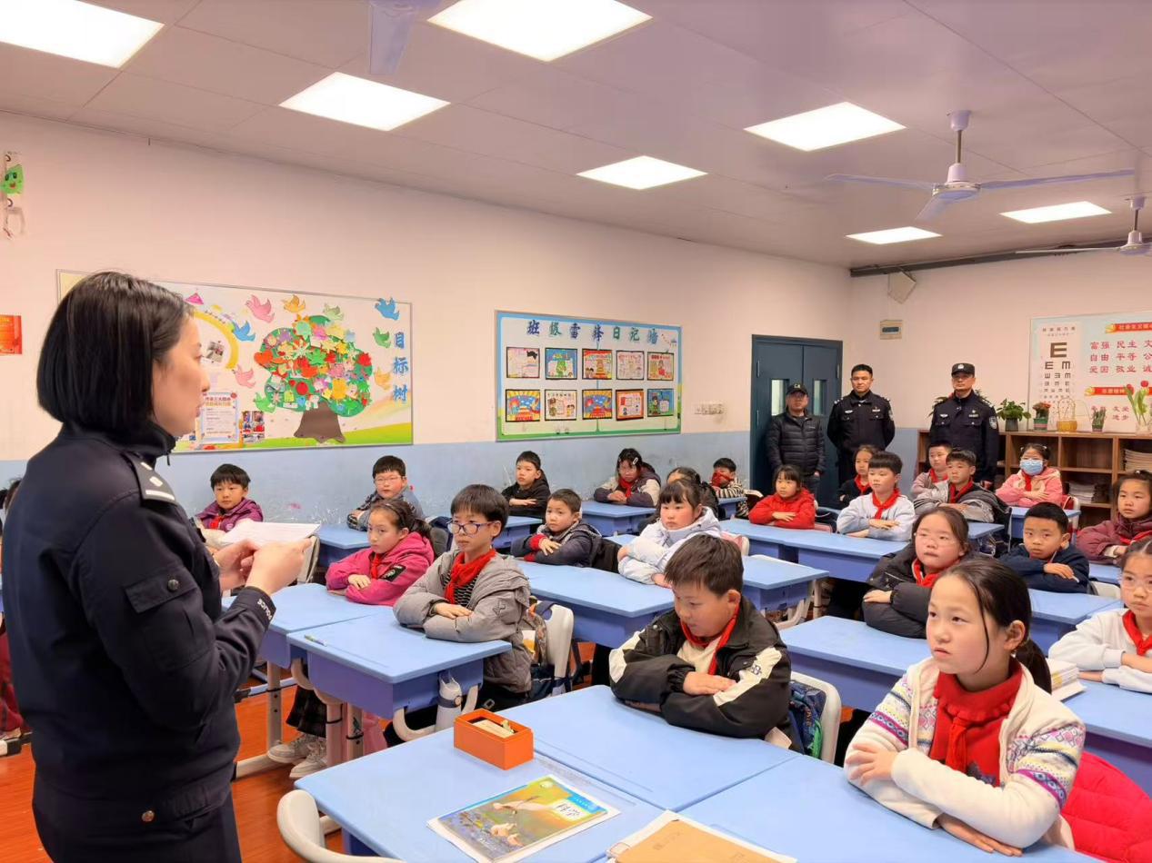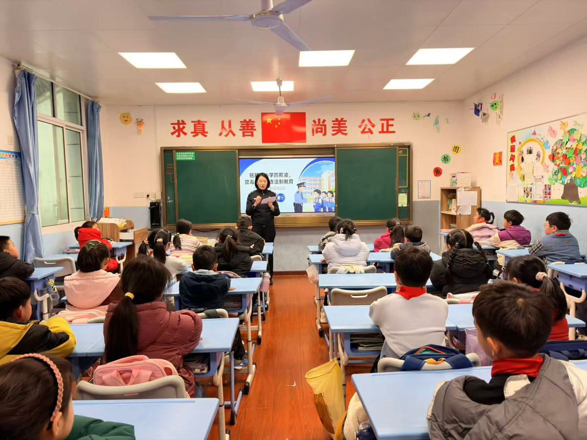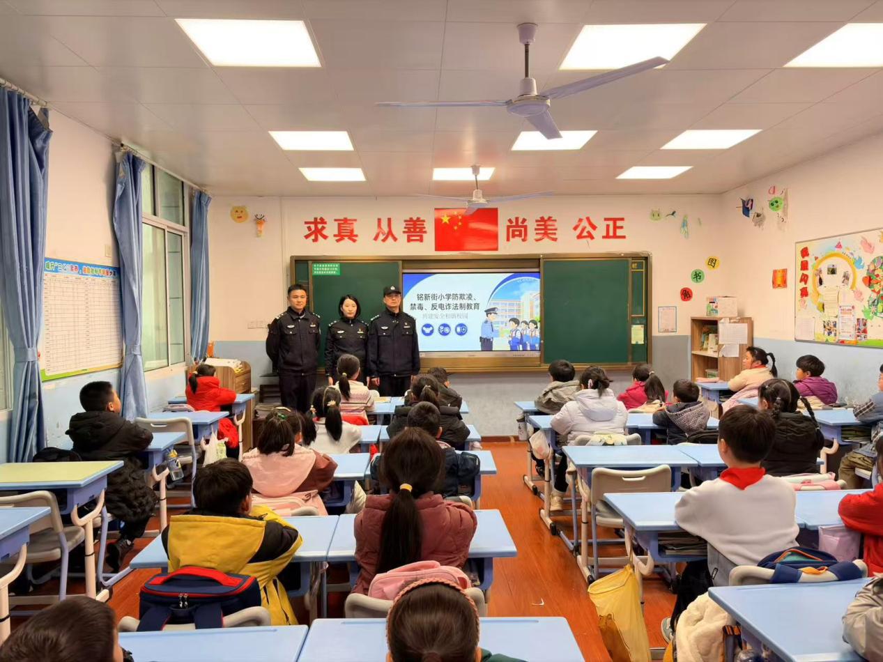为进一步加强校园法治宣传教育,提升小学生安全防范意识与自我保护能力,筑牢平安校园防线,3月17日,武汉市公安局江岸区分局大智街派出所民警黄晶、向兴仁、周涛走进武汉市江岸区铭新街小学,开展以防欺凌、禁毒品、反电诈为主题的法治教育专题课,为全校师生送上一堂生动实用的“安全法治课”。