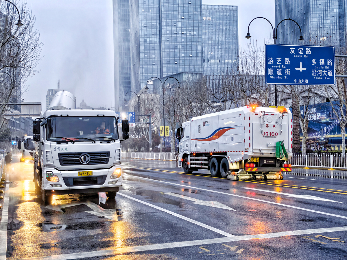 当天凌晨6时许,记者在硚口的中山大道民意四路至江汉一桥赛段看到,两台吸扫车分别在道路两侧不同方向缓行,一边快速旋转车底隐藏的一双红色“帚手”,将路面上的烟蒂、纸屑和树叶扫扒归拢,一边张开“车口”,将这些归拢的废弃物吸吞进“车肚”,尾随其后的两台高压洗路车冲洗着路面和路边人字沟及站卧石,车过路净、一尘不染。整个作业过程非常安静,没有以往柴油环卫车的轰鸣声。
