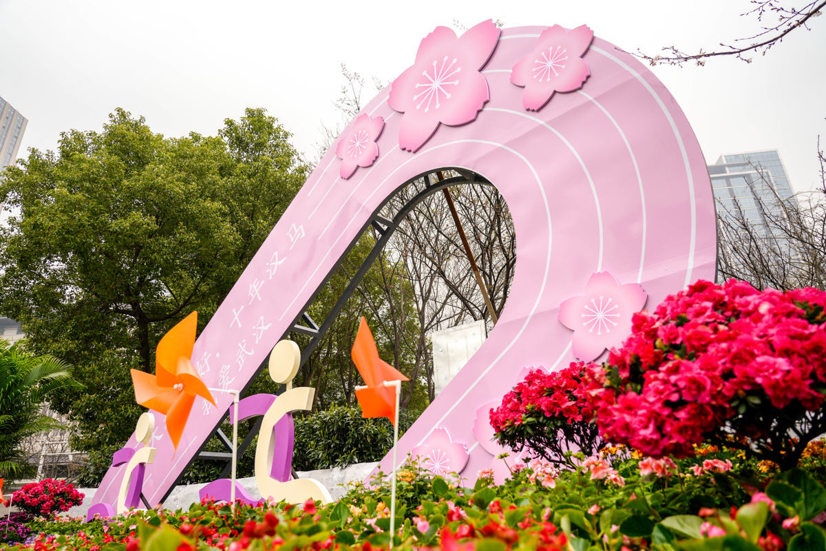 据了解,今年汉马赛事期间,武昌区除了打造两处特色景观小品,还对赛道沿线的绿化环境进行了全方位提升,在关键点位布置10万盆时令花卉,栽植160余株樱花,摆放箱栽樱花,精心勾勒“樱花赛道”特色景观,用“绣花功夫”为赛事保驾护航。