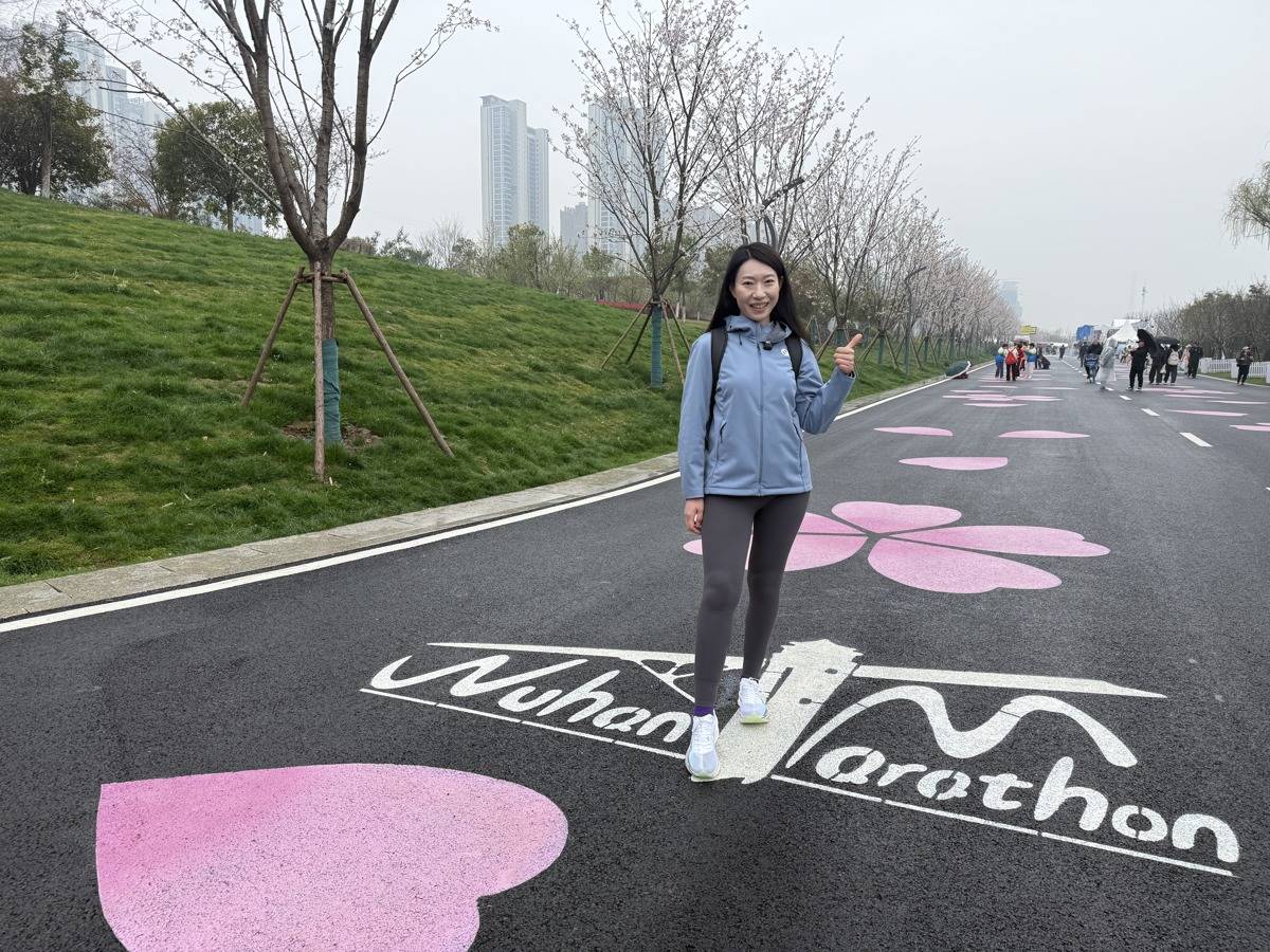 宋鹃在2026汉马青山江滩新终点樱花步道 (湖北日报全媒记者 倪娜 摄)