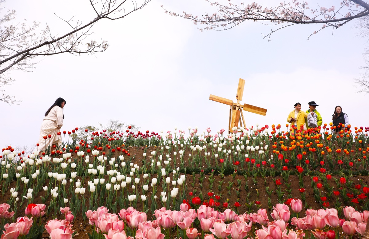 园区占地面积400余亩,栽植樱花苗木两万余株,涵盖早、中、晚樱共40多个品种,通过科学搭配实现花期无缝接力,花期从2月中旬持续至4月中旬,长达50余天,彻底打破传统樱花园“花期短、景观单一”的短板。“我们能火起来,主要有三个原因。”楚风樱海园负责人沈祥德向记者介绍,一是名字自带吸引力,“樱海园”顾名思义,樱花繁茂如海洋,花开时节遮天蔽日,视觉冲击力极强;二是打造差异化景观,让游客能在花丛中自由穿行,樱花树从低矮枝干就专业塑形,花枝低垂贴近游人,不用登高、不用找角度,随手就能拍出樱花环绕的氛围感大片;三是坚持原生态,搭配风车长廊、复古电话亭、古风亭台等打卡点,辅以油菜花、山茶花、玉兰等花卉,层次丰富、景致天然,再加上网络流量加持,迅速出圈。
