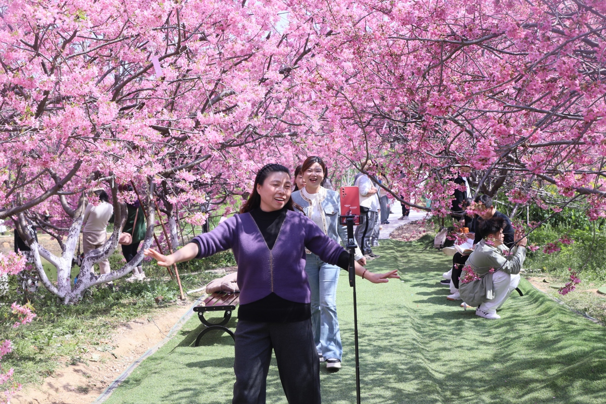 人气爆棚带来实打实的发展成效,2025年园区单日最高客流量达2万人次,不仅吸引全国各地游客,还迎来不少国外及港澳台地区游客前来观光,更成为东风岚图、华为问界等知名品牌的宣传取景地。火爆的赏花经济,更直接带动乡村产业发展,景区为周边村民提供了就业岗位,同时搭建土鸡蛋、手工油面、新鲜草莓等本地农产品销售渠道,打造“赏花+采购+食宿”一体化消费场景,带动周边住宿、餐饮产业持续升温,让花海美景真正转化为村民的“致富花”,成为仓埠街道农文旅融合助力乡村振兴的亮眼名片。沈祥德表示,明年园区计划扩大游客喜爱的樱花品种种植面积,进一步提升景观品质,吸引更多游客前来。