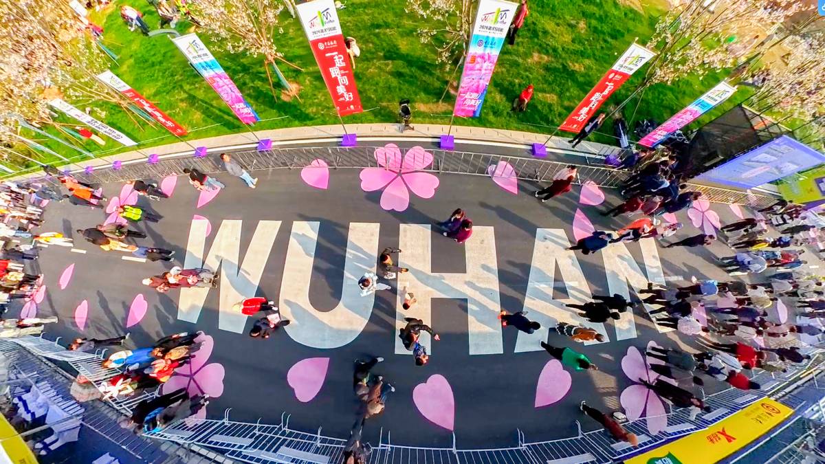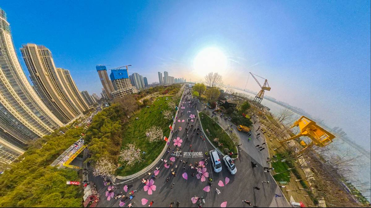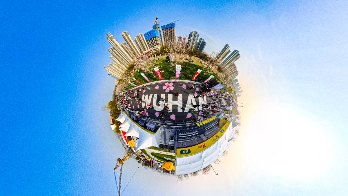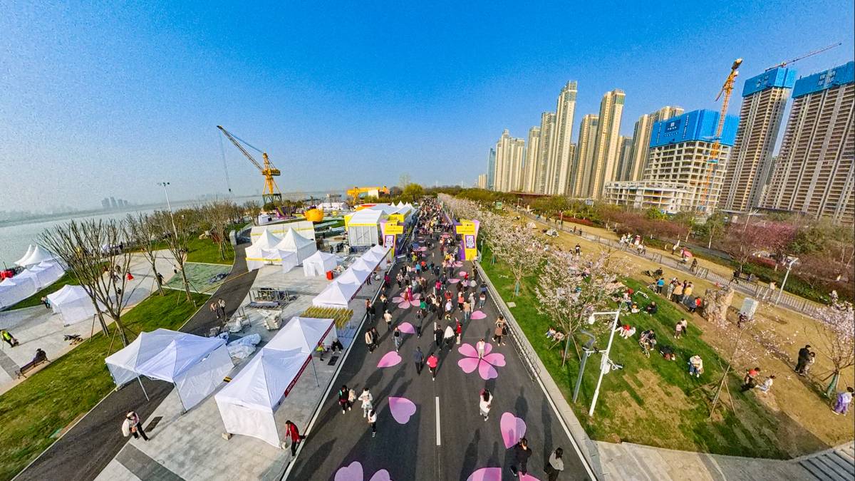2026年3月21日,2026武汉马拉松开赛前夕,位于武汉市青山区的青山江滩内的武汉马拉松终点人流如织,大批市民游客趁着春光,提前走上终点赛道拍照打卡!湖北日报全媒记者使用360无人机带你沉浸式感受“汉马”终点的浪漫樱花赛道。(湖北日报全媒记者 何宇欣 摄)