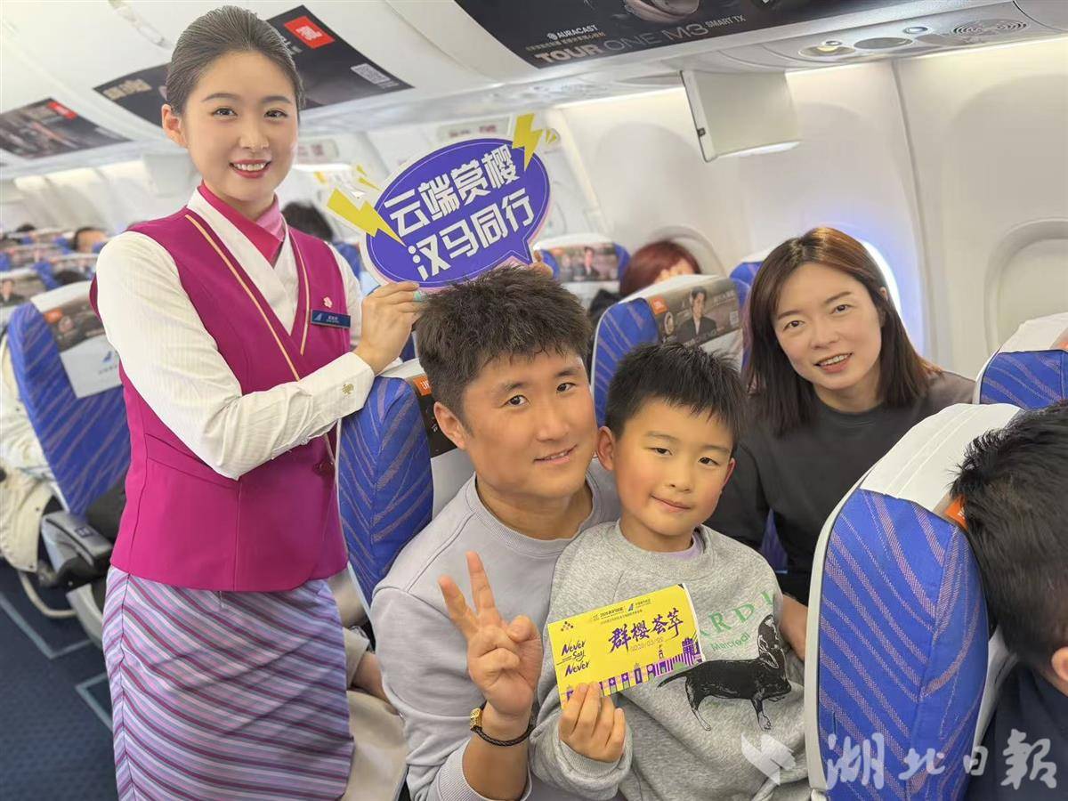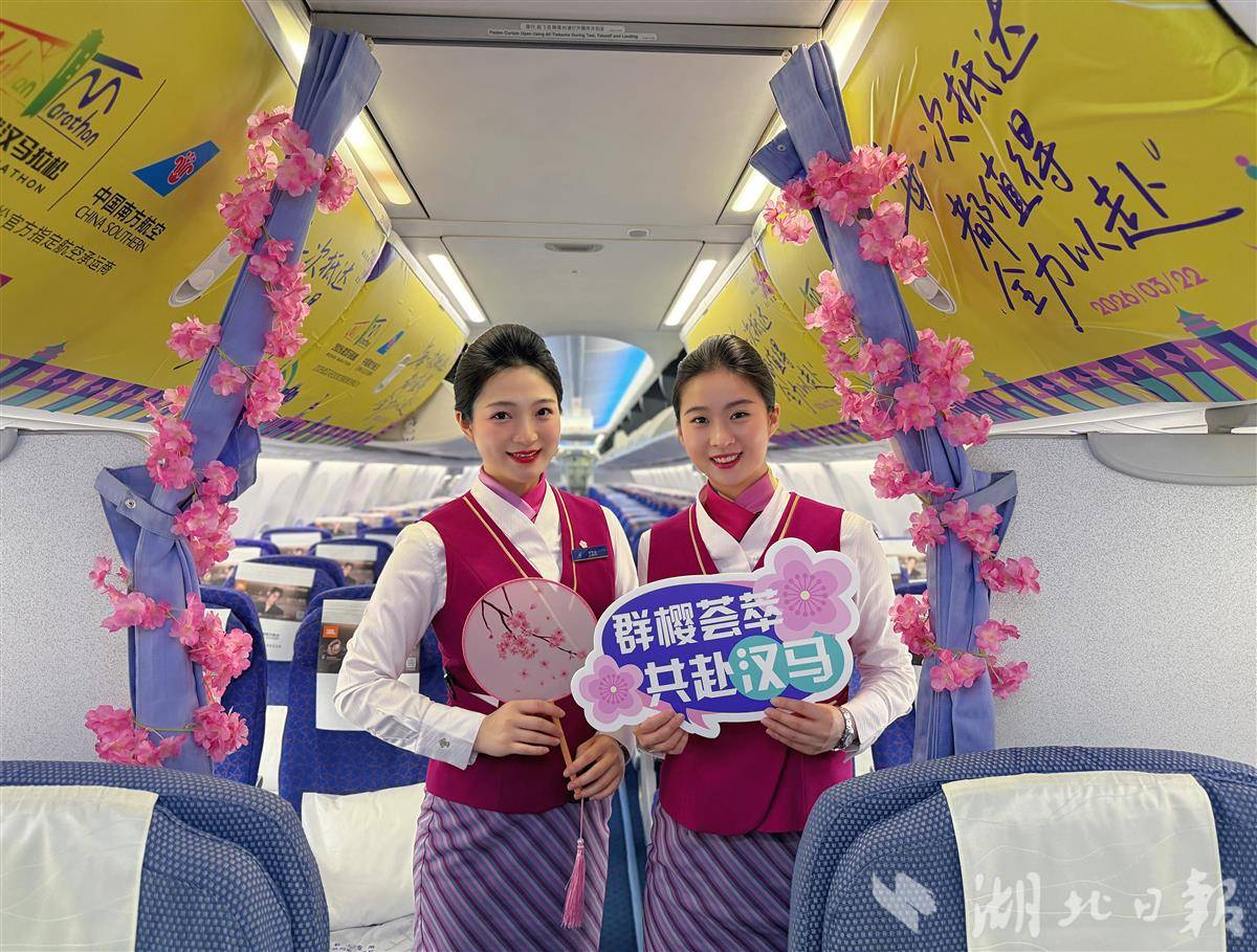 南航是今年汉马官方指定航空承运商。为此,南航湖北分公司在武汉天河机场打造了30班“云端赏樱·汉马同行”主题航班。该公司客舱部有关负责人介绍,主题航班在客舱内张贴汉马海报、点缀樱花装饰,并为旅客准备了特色明信片。“交通工具连接的是两座城市,也是武汉向外地客人打开的一扇窗口。我们希望通过这样的方式,让旅客在落地之前就走进这座城市的春天。”