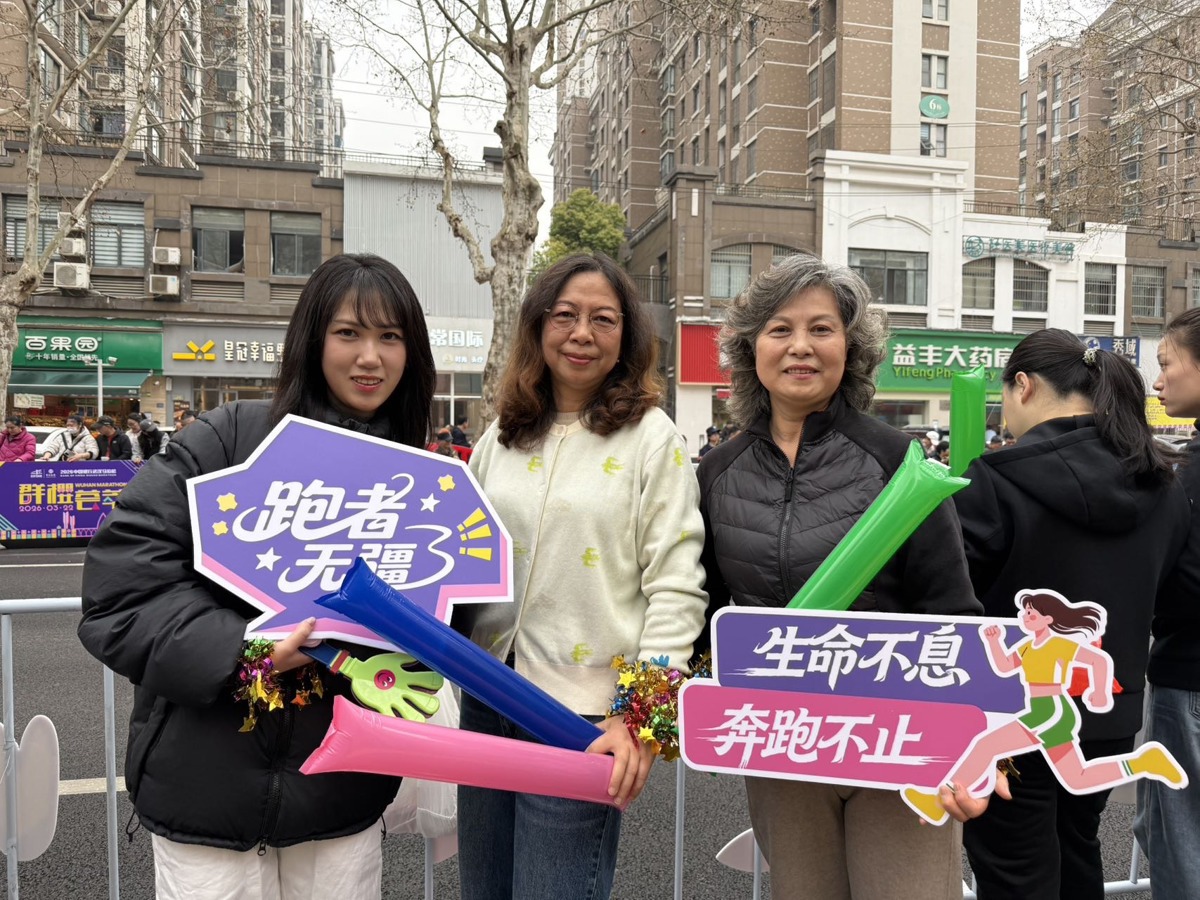 3月22日,2026年武汉马拉松在春日花色中鸣枪开跑。赛道之外,武汉市民用最质朴的热情,筑起了一道独特的风景线。家住武汉市青山区钢都花园的田女士一家,便是这“最强后援团”中的一员。