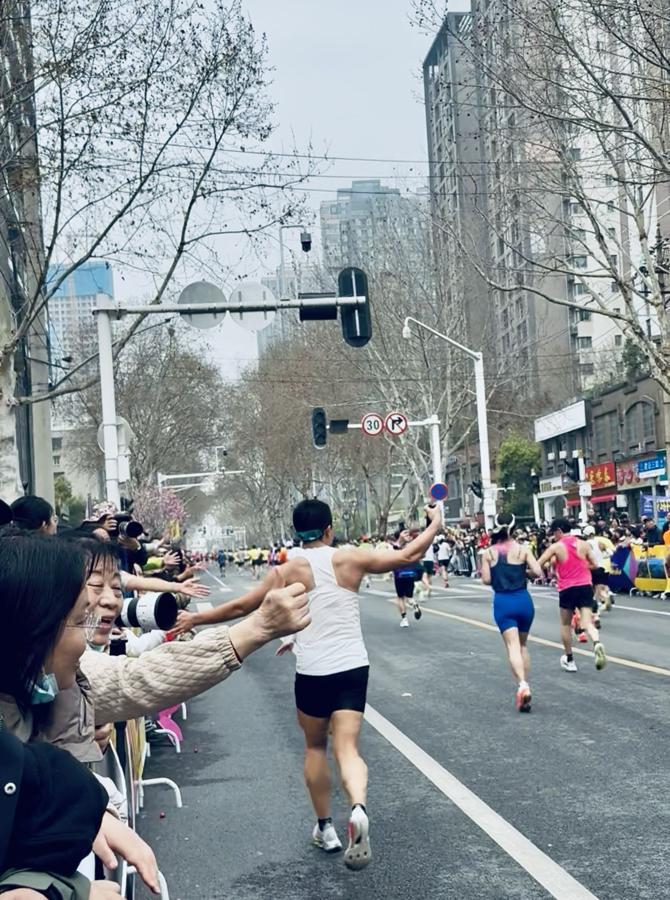 “加油!加油!”此起彼伏的呐喊声回荡在赛道上空。观众们自发喊起口号,不少人还用力挥舞着手中的加油棒,点燃了选手们的热情。而这份热情也得到了最热烈的回应——不少选手在奔跑途中主动与沿途观众击掌互动,有的停下脚步合影留念,甚至还有人张开双臂,与素不相识的加油者热情拥抱。