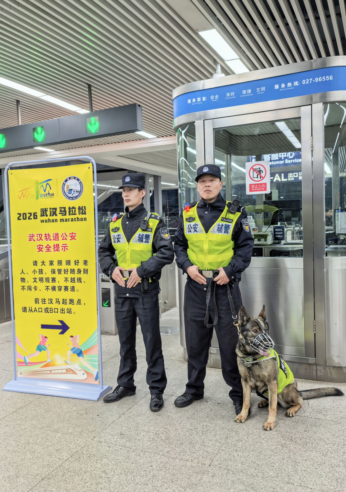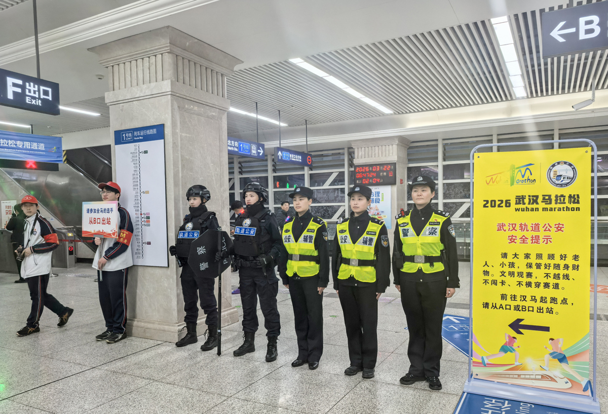 群樱荟萃,汉马鸣枪。3月22日7时30分,2026武汉马拉松正式开跑。为确保赛事安全顺利进行,武汉市公安局轨道交通管理分局全警投入,全力以赴,扎实开展巡逻防控、隐患排查和服务乘客等工作,全力保障全市轨道交通运营安全,全力护航参赛选手出行平安。