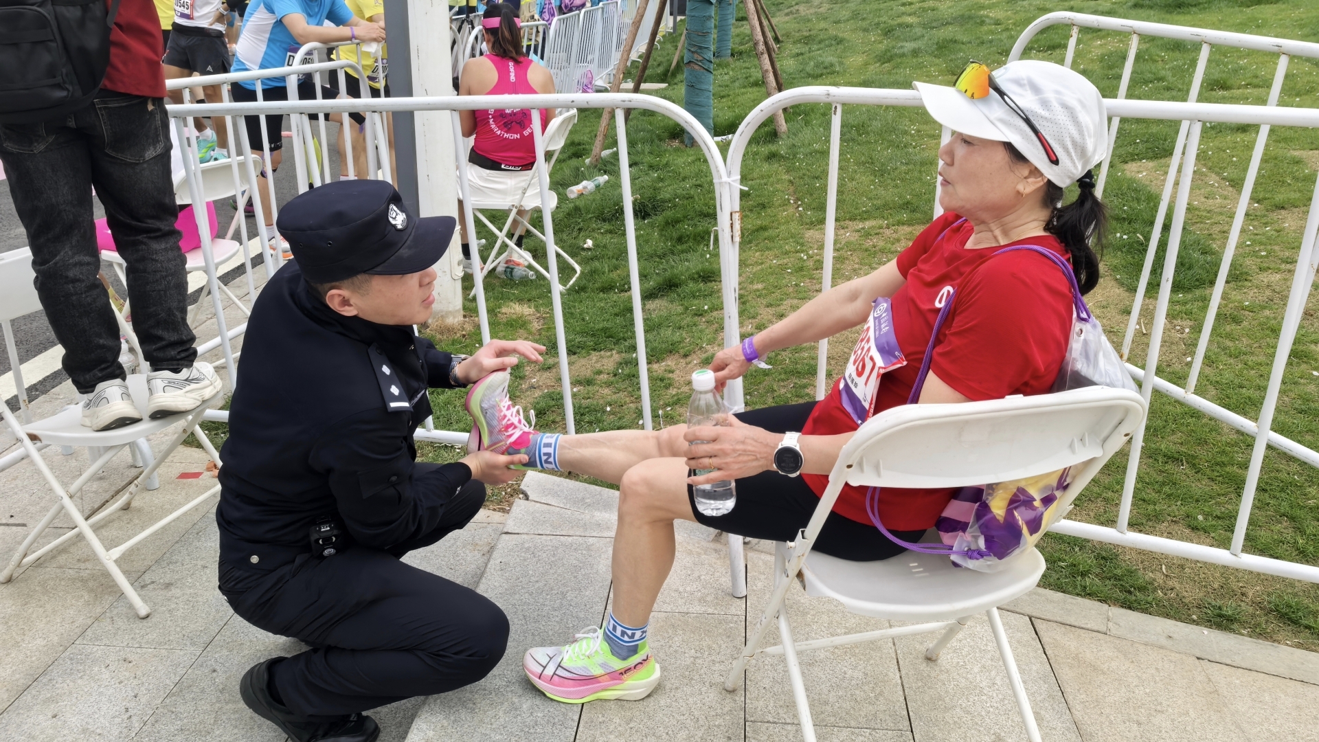 疏散过程中,民警依旧坚守暖心服务不打烊。不少选手赛后出现腿部酸痛、肌肉抽筋等不适症状,沿线执勤警力主动靠前,递上饮用水、协助拉伸按摩,细心搀扶体力不支的选手前往休息区,用贴心服务为赛事画上温暖句号。
