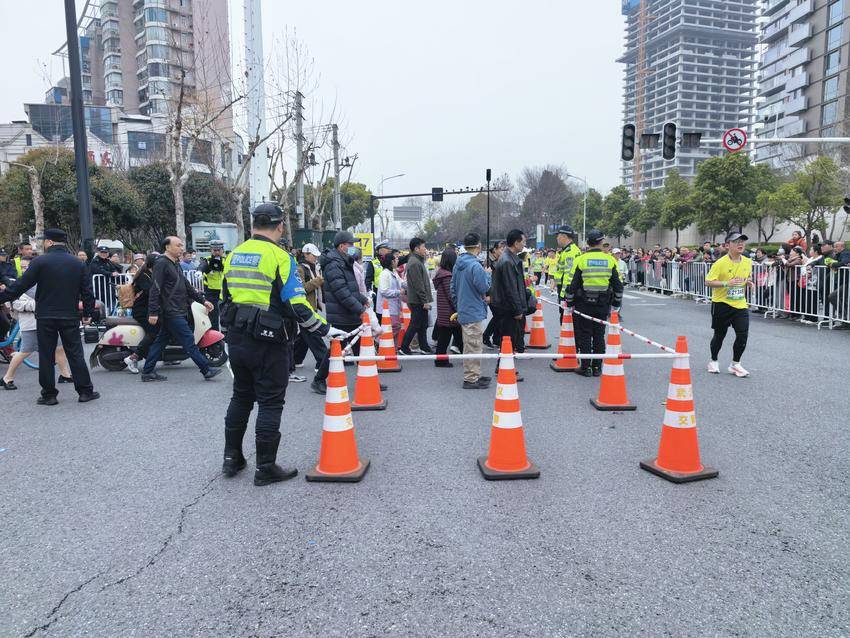 “第一名半程马拉松选手即将冲线,请为选手让出缓冲空间。”8时52分,在书卷路半程马拉松终点,刑侦大队五中队负责人於兆鑫带领民警段铸洪、黎天旸等密切配合,高效维护终点秩序,快速引导完赛选手进入缓冲区。