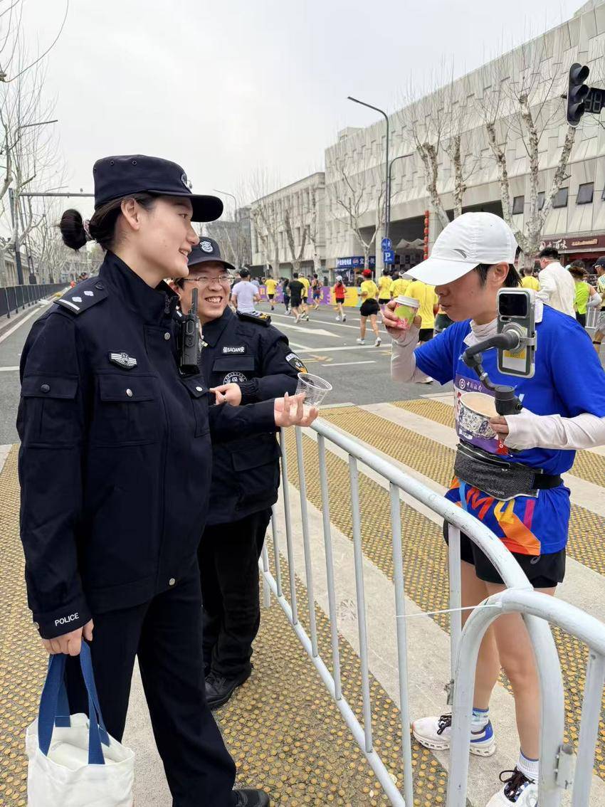 “一口咖啡,能量满满,感谢警花!”9点30分许,在红巷路口补给站,为防止选手扎堆,中华路街派出所民警张橙橙与志愿者分工协作,将咖啡、米酒、盐丸等逐一递到选手手中,并引导大家分散补给,有序维护着赛道周边秩序。