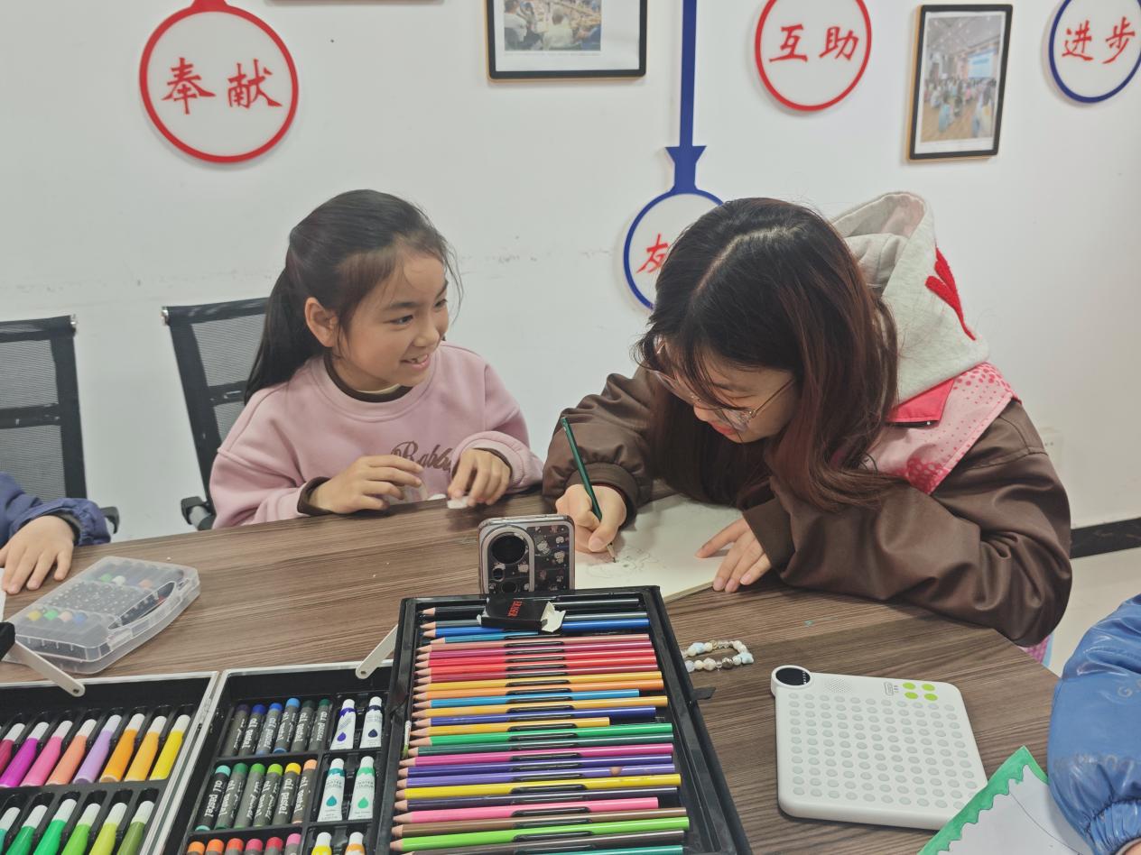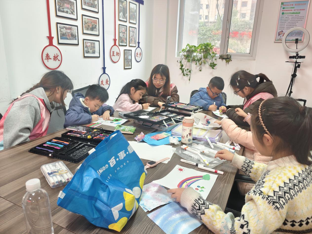 手工实践环节同样绿意盎然。孩子们拿起画纸、彩笔等工具,在大学生志愿者的耐心指导下,一笔一画描绘心中的绿色家园,一棵棵挺拔的树木、一只只活泼的小动物跃然纸上,承载着孩子们对自然的热爱与守护。这些充满童趣的画作,将在社区进行展示,让绿色理念从课堂延伸到社区的每个角落。