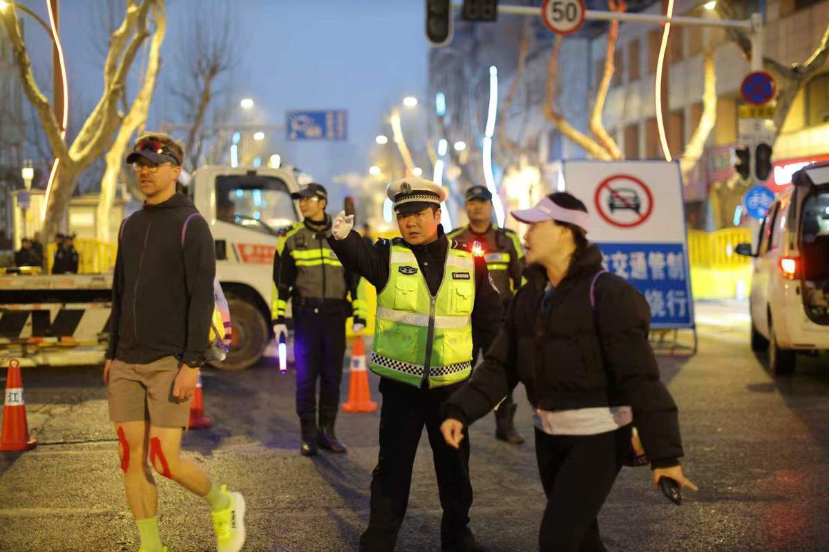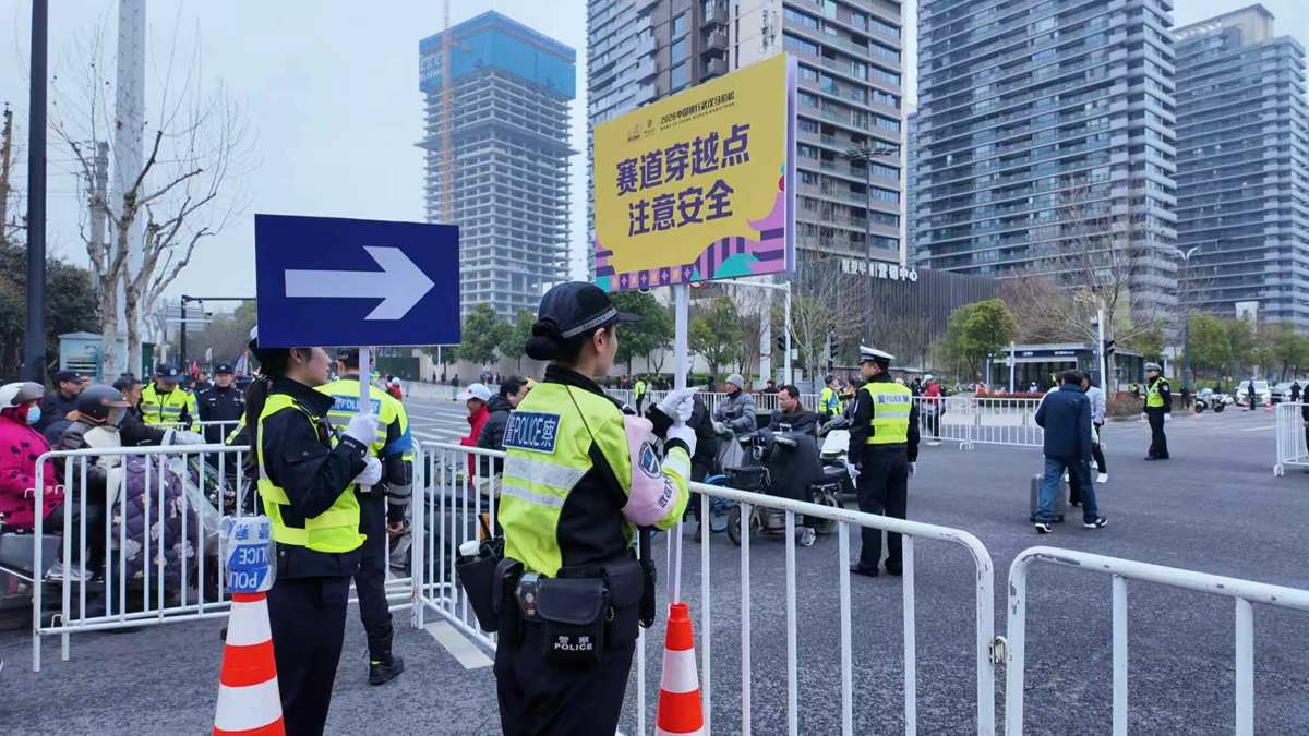 “您好!今天赛道全封闭,得绕一下,我给您指路。”凌晨4时许,起跑仪式区域与运动员集结区内,江岸区分局执勤民警已集结就位。三阳路起跑点,交通护栏、组委会广告板与“水马”构成的物理隔离带,将运动员集结区、起跑仪式区、主席台区等功能区域清晰划分。民警在沿线安检门和各路口严阵以待,耐心引导晨光中赶来的群众和参赛选手。