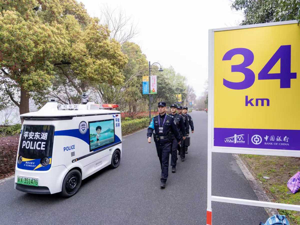 清晨6时,东湖绿道34公里处,无人警车与巡特警队员联合开展巡逻,滚动播报道路临时管控信息。码头边,东湖生态旅游风景区分局水上巡逻力量已整装待发,三路巡逻艇沿东湖南路、磨山梅园码头、东湖楚风园水域穿梭巡弋,随时待命开展救助与应急保障,为赛道内外撑起一片安心水域。