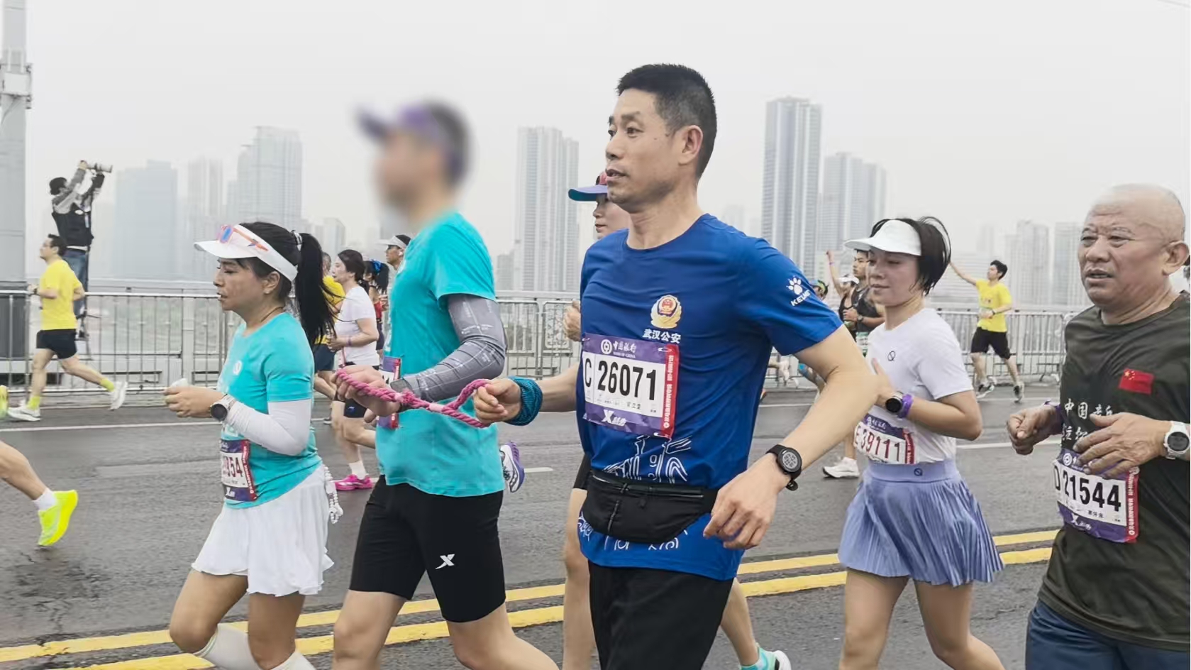 7时30分,发令枪响,全程马拉松正式起跑。拥挤的赛道上,青山区分局巡特警大队民警黄立望身着武汉公安藏蓝色护跑战衣,化身为视障跑友小刘的“双眼”。“前方直线行驶,保持节奏!左侧来人,可小幅避让。”凭借丰富的护跑经验,黄立望以陪跑绳为纽带,精准提示路况、把控节奏,一路引导小刘避障前行,向着终点稳步迈进。