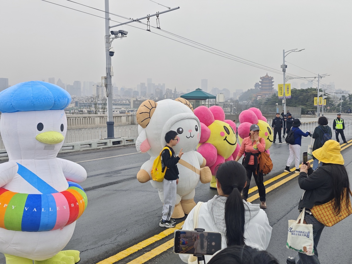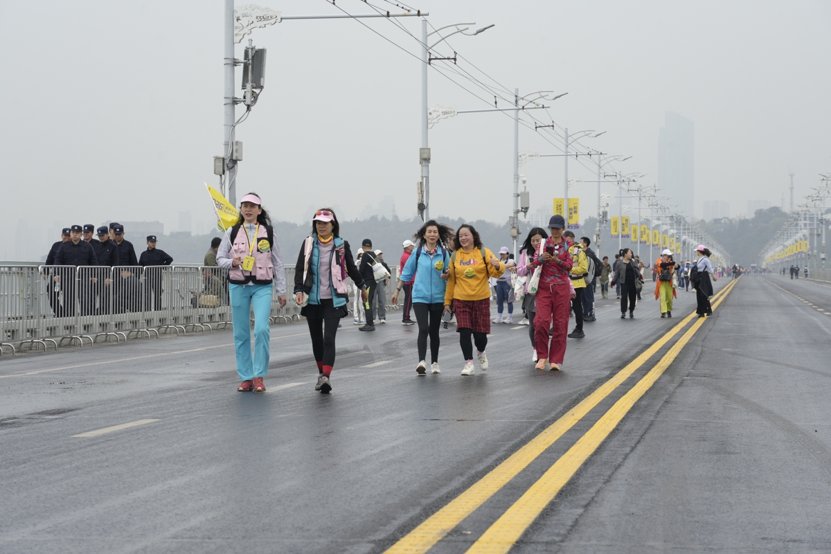 上午10时,参加“跟着汉马走大桥‘花点’时间游武汉”定向游活动的队伍陆续走上长江大桥武昌段。“第一次以徒步的方式走过长江大桥,一路风景很好,尤其长江大桥很干净,为环卫工人点赞。”来自武汉的市民朱女士和朋友五个人一起参加了此次“跟着汉马走大桥‘花点’时间游武汉”定向游活动,边走边拍照留念。朱女士开心地分享,汉马选手刚跑过,桥面就这么干净,让她很意外,也向所有跑者展示了武汉的热情和高效。