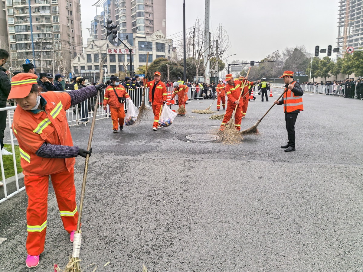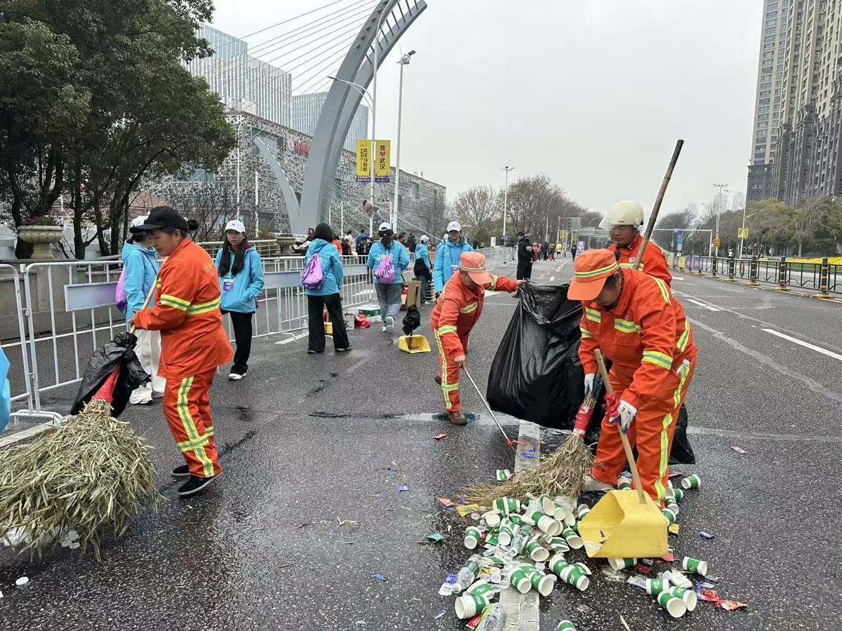在临江大道、新生路、书卷路半马终点等路段,武昌区城管执法局二桥清洁队、中南路清洁队也根据路段赛事情况开展清理工作,确保人走场清。在书卷路省图书馆半马终点处,武昌城管中南路清洁队环卫工作人员不仅承担了保洁任务,还自发地当起了指路引导员,大家都佩戴了志愿指路员的标识,快速引导人员散场,为汉马赛事做更多更好的服务。