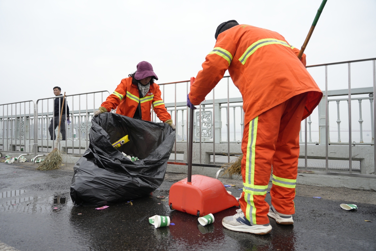 上午11时10分左右,长江大桥已经恢复通车。“虽然较往年延长了作业时间,但是市民游客体验感好,我们工作就有成就感。”参加保障的大桥清洁队环卫工人周命说道,其间他和其他环卫工作人员也会帮徒步的行人拍照。