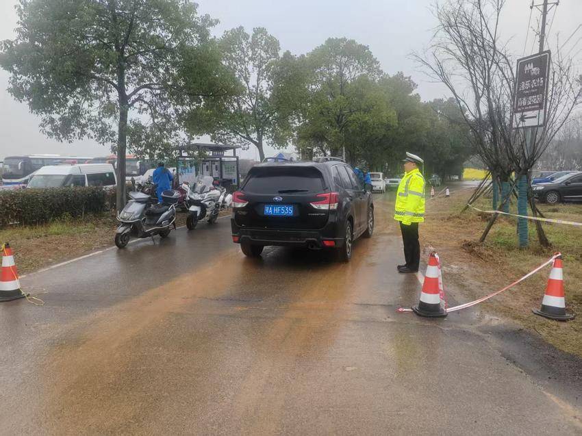 春雨淅沥,交通疏导一线“警”力全开。交管大队七中队(贺站)民警辅警提前到岗、冒雨坚守,在景区入口、停车区域分段值守。雨中民警抬手示意、耐心引导,指挥车辆有序通行、规范停放。看到一辆农用三轮车正准备载人驶入主路,民警快步上前拦住:“老哥,雨天路滑,后面不能坐人啊,不安全。”车主连连点头,让乘客下车步行。民警辅警主动走近其他农用三轮车驾驶人,面对面叮嘱安全注意事项,严查违法载人、超速占道等隐患,把平安知识送到群众心坎上。