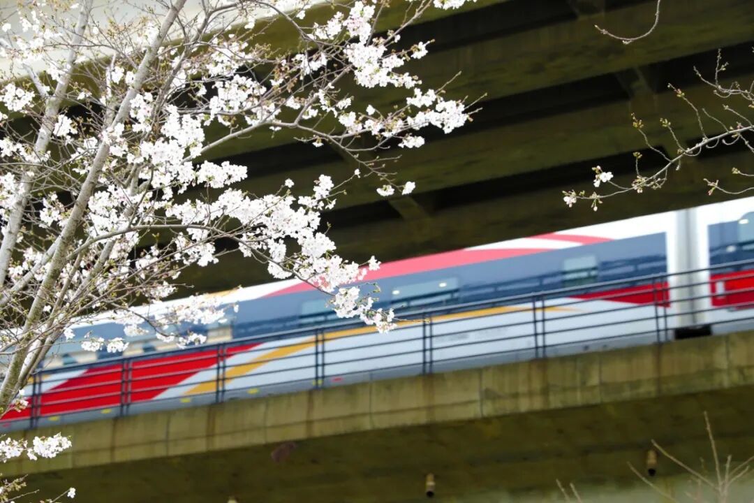 相较于园中游客,高铁上的旅人视角或许更为独特——一侧是樱花缠绵,一侧是油菜金浪,就连赏花打卡的游人,也成了他们眼中的风景。
