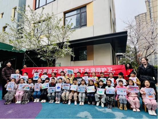 课堂结束后,学生们在楼下广场绘制节水宣传画。他们运用彩色画笔,围绕水滴、地球、鱼类等元素进行创作,通过绘画表达对水资源的理解。活动通过寓教于乐的方式,帮助幼儿在实践过程中加深节水意识。