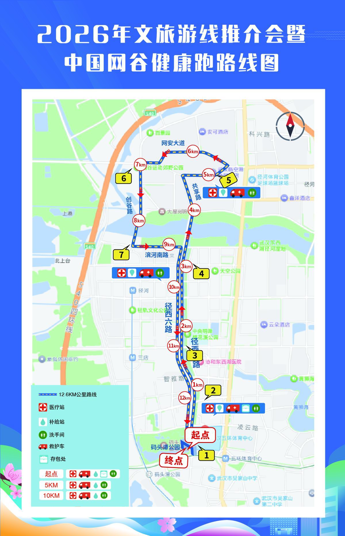 比赛时间为上午9:30至11:40,赛事起终点均设在码头潭公园,途经径西六路、共享路、网安大道、创谷路、滨河南路等路段,一路串联起区域核心景观与功能节点,跑者穿行其间,观众亦可沿赛道见证速度与毅力的较量。为保障赛事顺利开展,主办方在起终点及赛道沿途5公里、10公里处设置补给点与饮水站,提供饮用水、功能饮料、水果、糕点及本地特色美食;同时在起终点及5公里、10公里处设立固定医疗点,赛道沿线配备流动AED医疗救援服务人员及多名急救跑者,全方位护航每一位跑者。比赛将录取男子、女子个人前八名,颁发奖牌及奖品,巅峰对决值得期待。