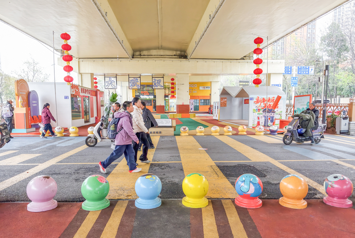 “除桥墩打造外,文旅板块也是此次改造的一大重点。”中建七局华中建设有限公司江夏印巷项目负责人何德福介绍,11个单双层彩绘集装箱错落排布,熊猫、街头文化图案明艳活泼。“后期,这块2851平方米的文旅商业区域,将引入咖啡、文创、体育用品等业态,让打卡的市民能逛、能歇、能体验。”