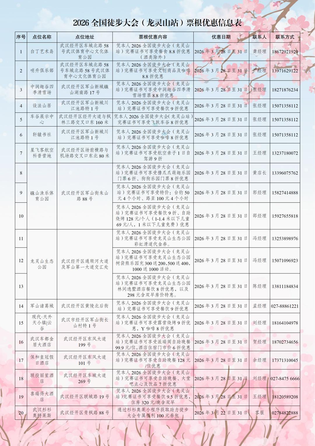 在沌口,白丁艺术岛、哨升俱乐部、武汉车都金盾大酒店、保和皇冠假日酒店、联投丽笙酒店、喜瑞得大酒店、武汉杉杉奥特莱斯也都诚意满满,携手为徒步爱好者送上“大礼包”,餐饮、文创、住宿、购物一应俱全。