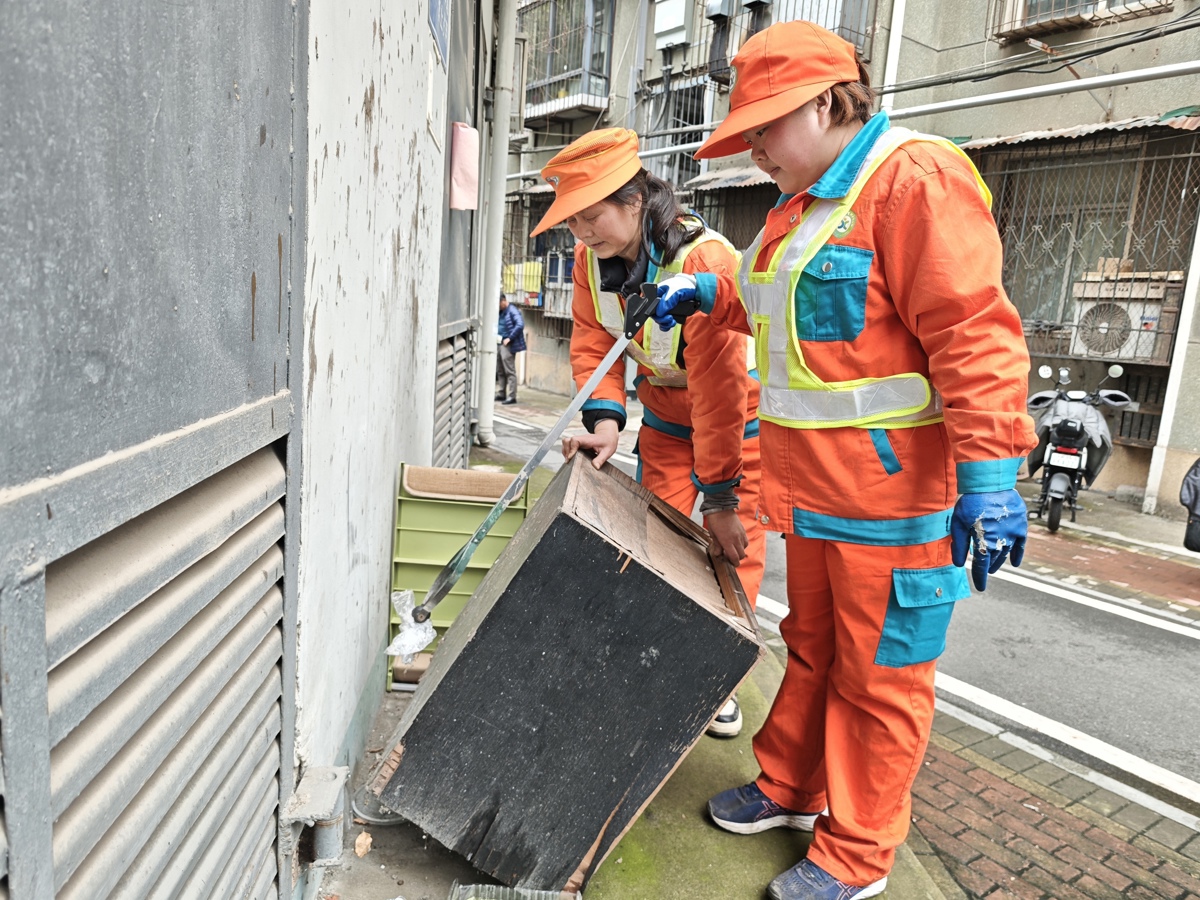 窨井口的垃圾,师徒俩当场清了个干净。但那堆陈年杂物体量不小,一时半会儿搬不完。王自宁掏出对讲机,将详细地址、问题类型等一一上报给片区负责人。没过多久,片区负责人带着其他保洁人员赶到现场。大家齐上手,搬的搬、清的清、擦的擦,不一会,这处杂物堆便被清理得清清爽爽。