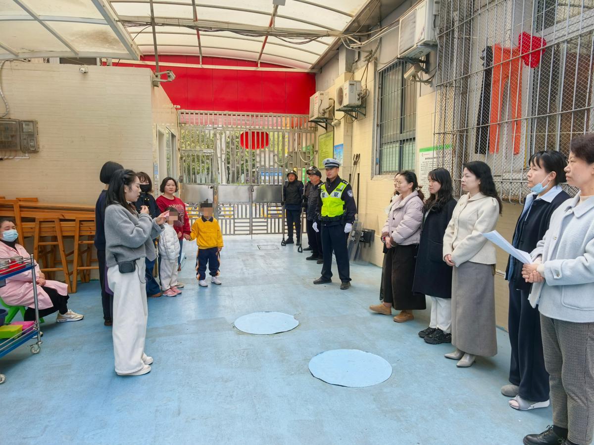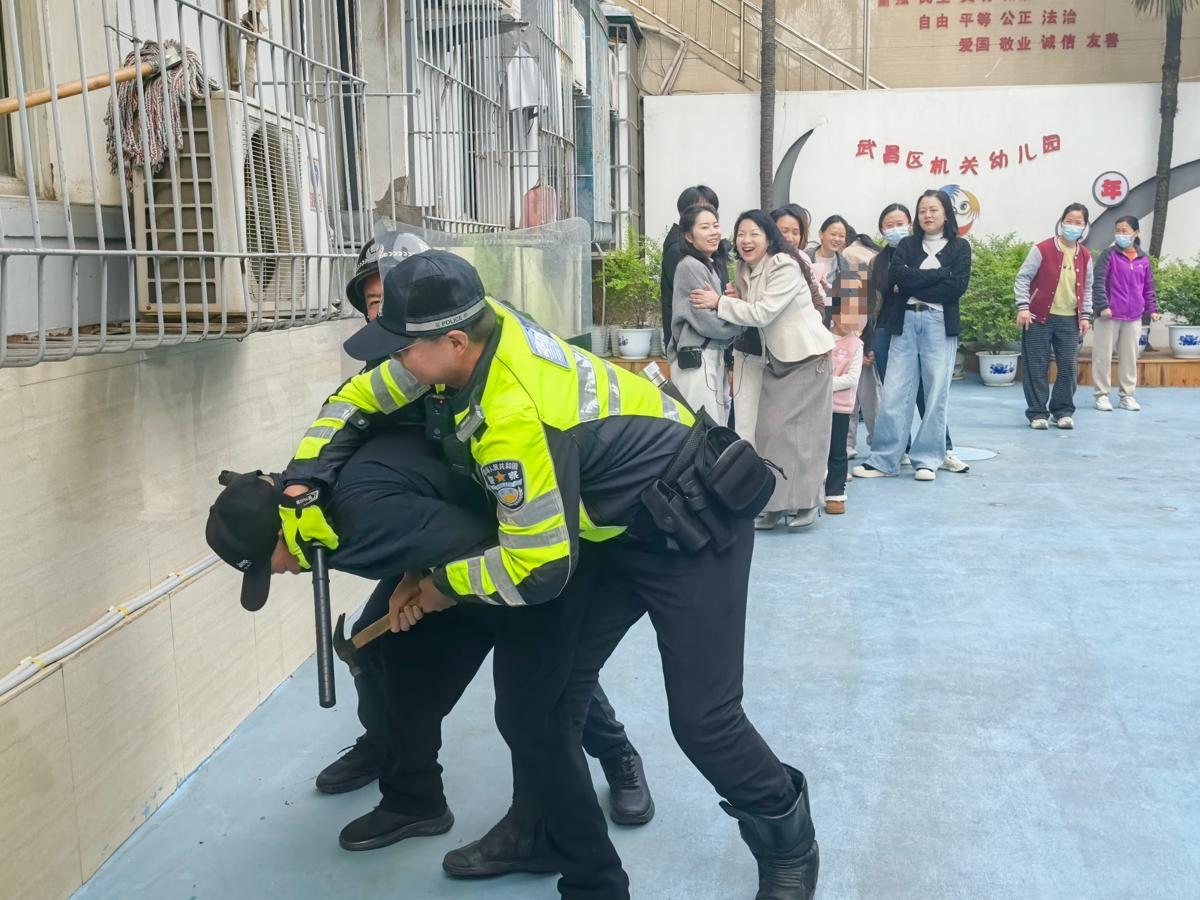 3月25日下午,一场校园安全应急演练在武昌区机关幼儿园展开。活动开始,武昌区公安分局交管大队护学岗二中队副中队长高梓健和快骑队员夏静海上场,演练了如何规范、高效处置突发事件,将“不法分子”快速制服。老师和孩子们看得聚精会神,纷纷鼓掌。