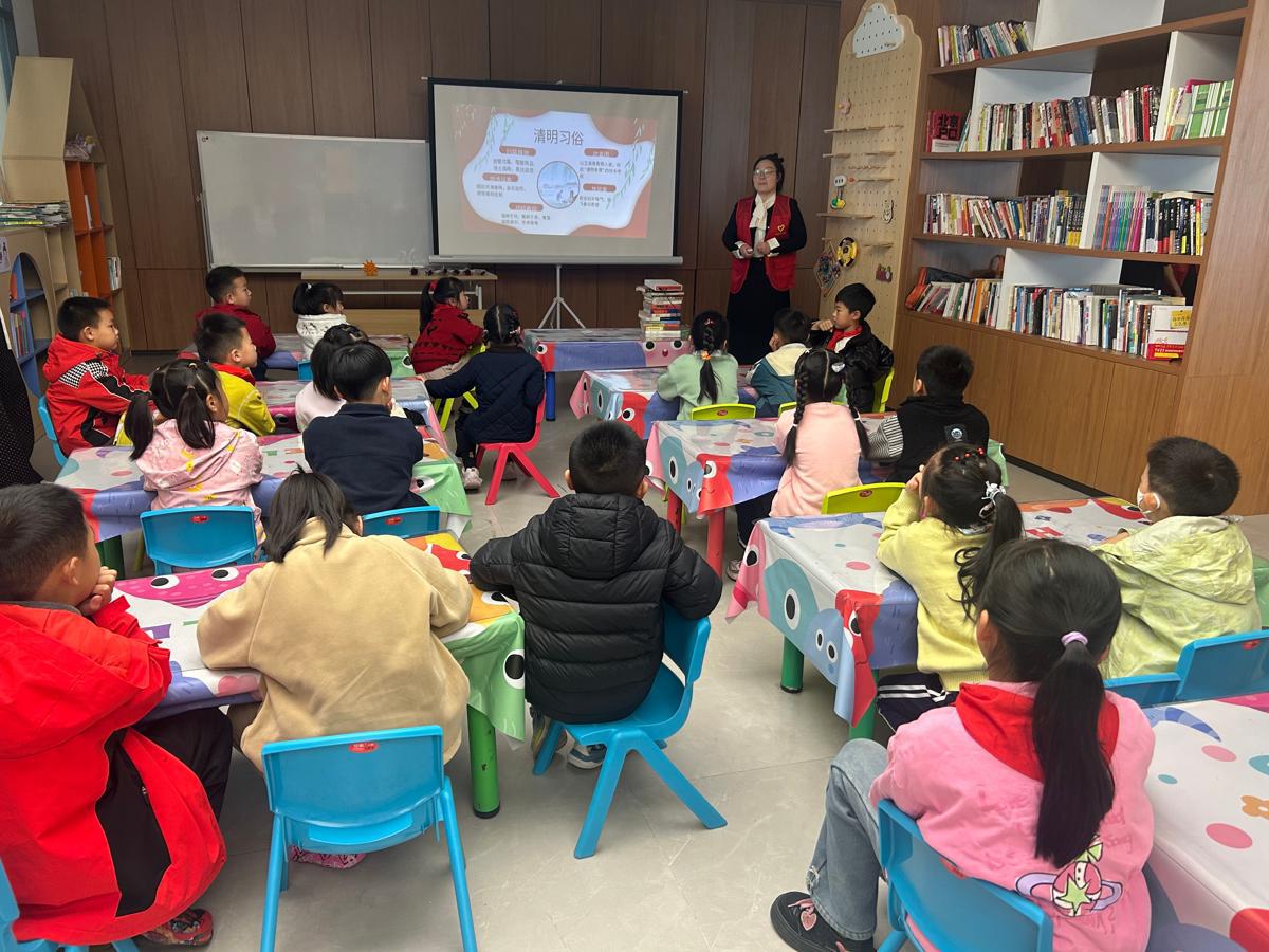 活动伊始,志愿者带着孩子们唱起轻快的《二十四节气》儿歌,瞬间活跃了现场气氛。紧接着,志愿者拿出图文绘本,用通俗的语言讲解清明节的由来和扫墓、踏青等习俗,还穿插互动提问。“我知道!清明节要和家人一起去怀念祖先。”一名孩子立刻举手大声回答,现场氛围愈发热烈。