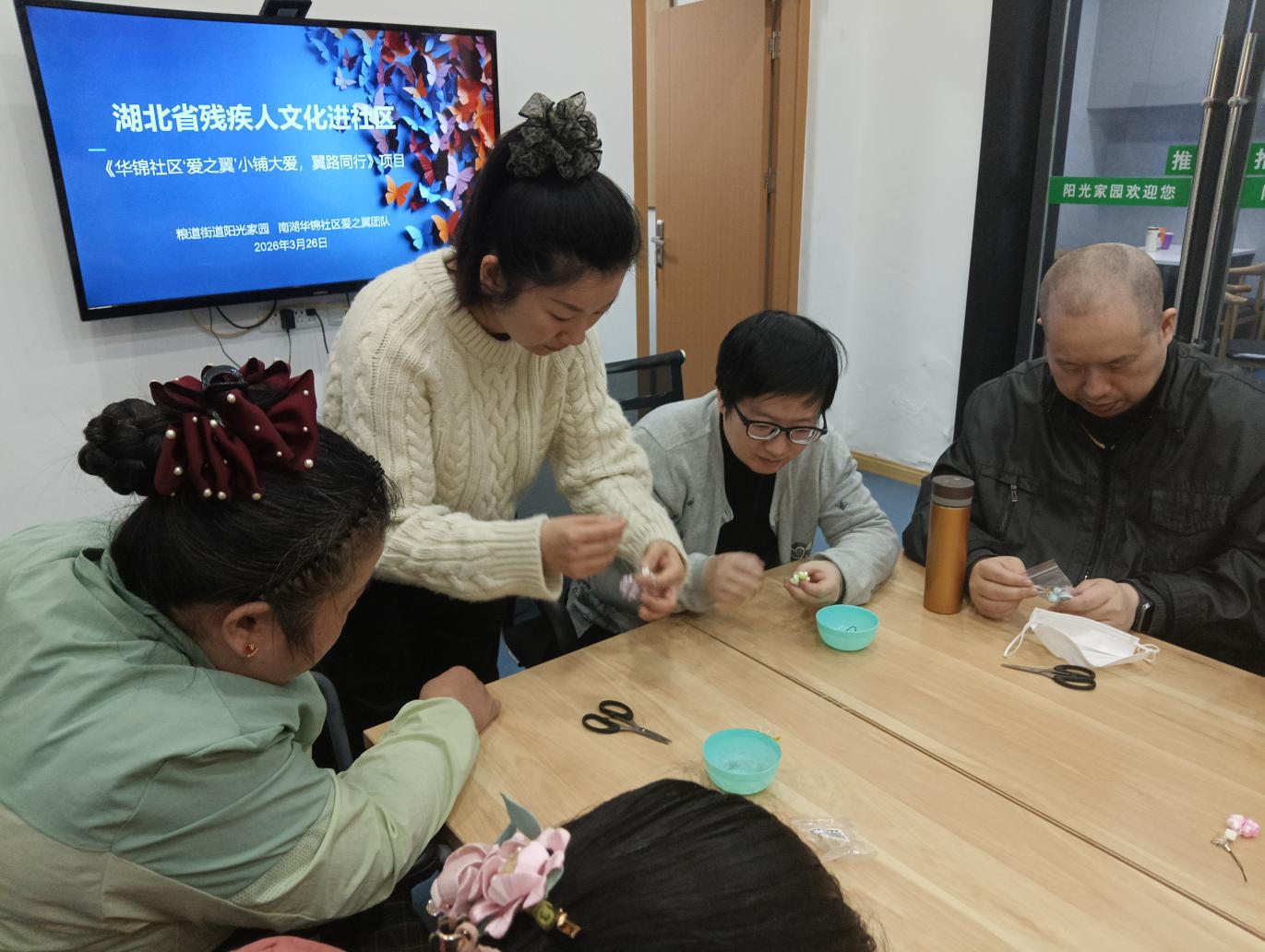 3月26日,武昌区粮道街阳光家园内充满欢声笑语,手工制作的乐趣萦绕在每个角落。南湖街道华锦社区爱之翼残疾人志愿服务队走进这里,与粮道街阳光家园的学员们携手开展手工制作联谊活动,以巧手传温情,以互助增友谊,共度一段充实又快乐的时光。