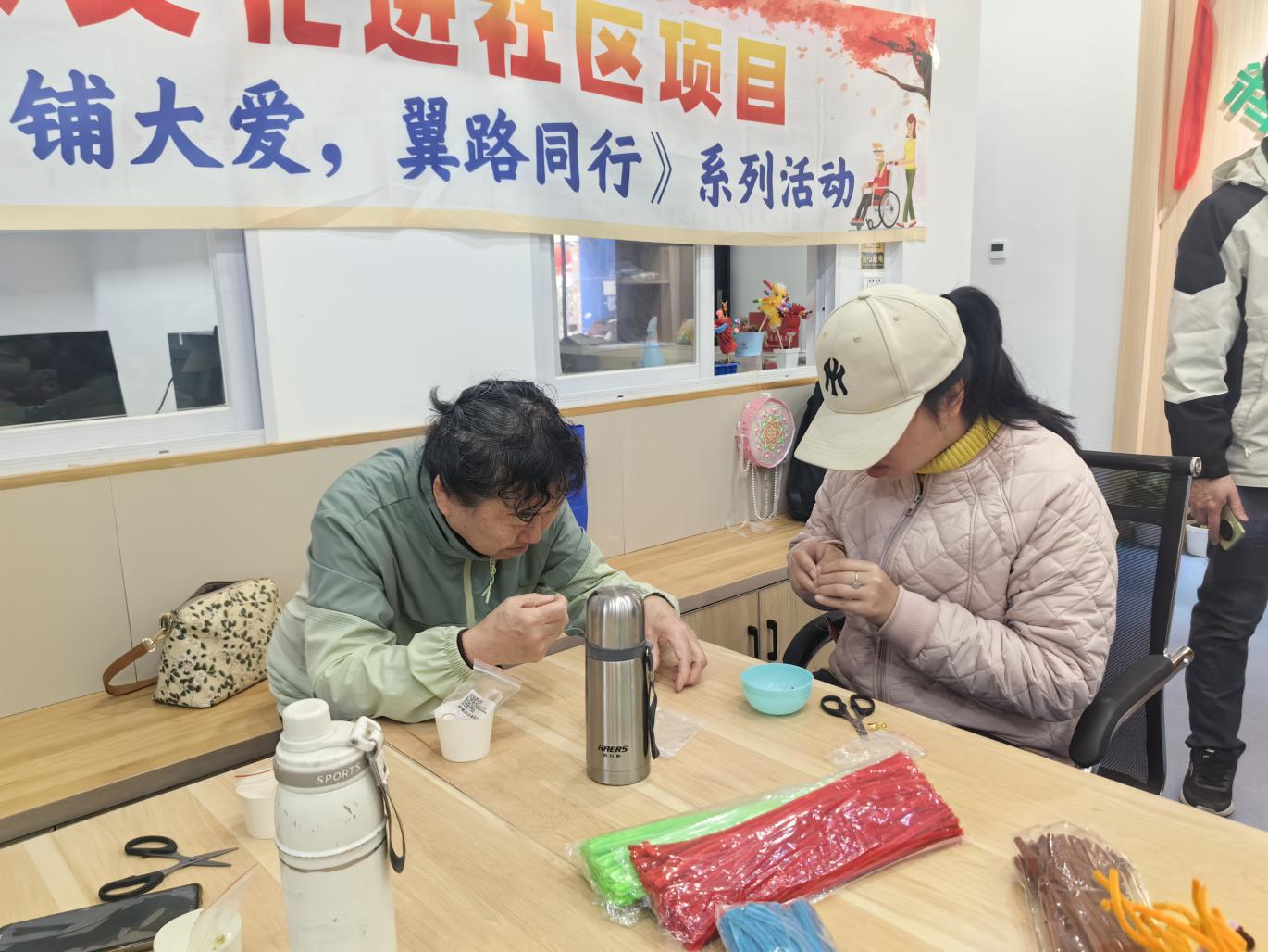 与此同时,粮道街阳光家园的学员们也毫不吝啬,热情带领爱之翼团队的队员们学习手工串珠制作,大家互相交流、互帮互助,专注于手中的手工创作,现场满是交流探讨的温馨画面。