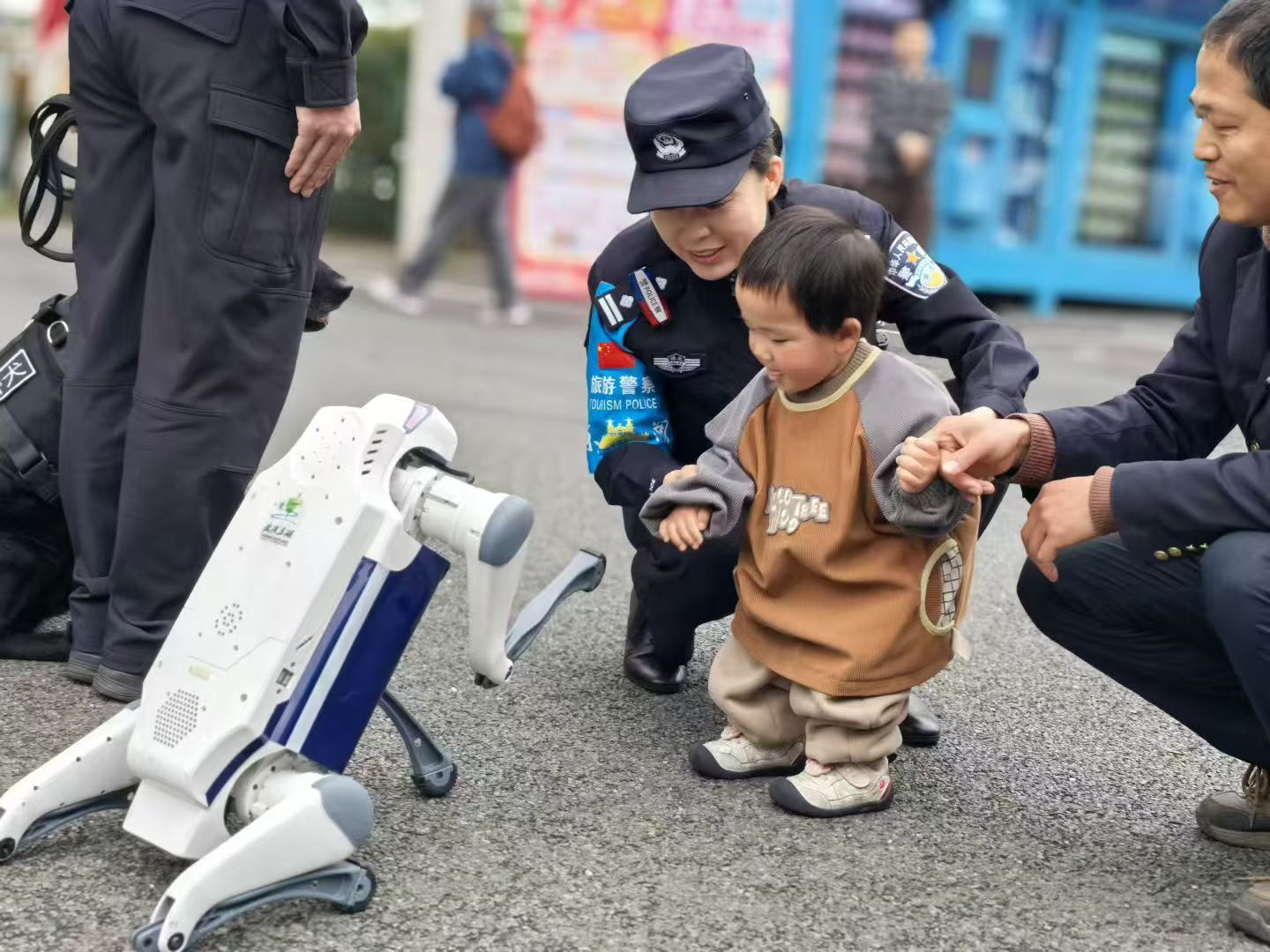 赏花季期间,功勋犬“启生”每日都会佩戴好执勤装备,跟随训导员沿东湖绿道、樱园核心区开展巡逻,配合民警完成现场防控工作。与它一同值守的,还有刚完成大模型升级的警用机械犬,升级后不仅能承担巡逻、应急处置辅助工作,还能与游客实时语音对话,精准解答赏花路线、周边停车点位、便民服务点位置等各类咨询。