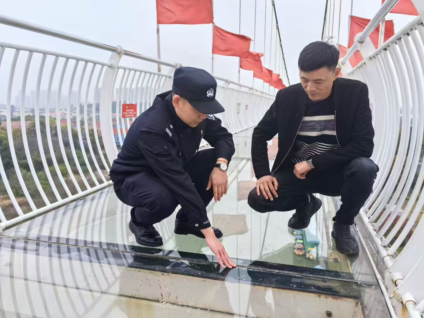 “玻璃天桥的复检报告再给我核对一遍,拉锚的拉力数据、玻璃的承重检测数据,每一项都不能有疏漏。”3月24日,蔡甸区分局大集街派出所社区警务队队长李斌,正拉着花博汇景区游乐项目负责人,对网红玻璃天桥开展安全专项检查。